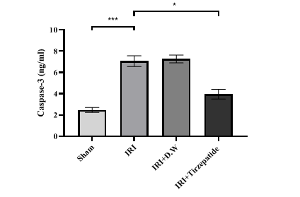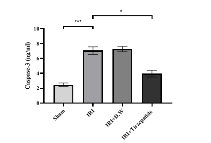 Fig. 5 After 30 min of ischemia, rats were reperfused for 24 h. They were pretreated 2 h before ischemia with either vehicle D. W, tirzepatide (3 mg/kg), or left untreated (sham and IRI group). Renal caspase-3 concentrations were assessed utilizing ELISA kit. Following one-way ANOVA, data were analyzed using Bonferroni multiple comparison test. Data were represented as mean±SEM, n = 7 rats per group; *P<0.05, ***P<0.001.