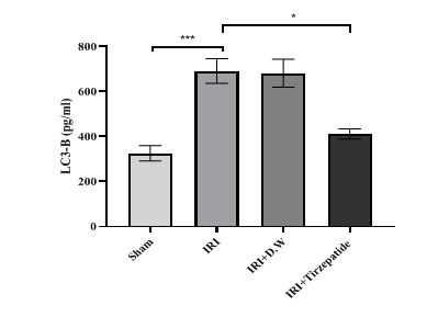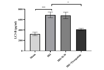 Fig. 7 After 30 min of ischemia, rats were reperfused for 24 h. They were pretreated 2 h before ischemia with either a vehicle D. W, tirzepatide (3 mg/kg), or left untreated (sham and IRI group). Renal LC3-B concentrations were assessed utilizing ELISA kit. Following one-way ANOVA, data were analyzed using Bonferroni multiple comparison test. Data were represented as mean±SEM, n = 7 rats per group; *P<0.05, ***P<0.001.