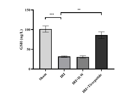 Pretreatment with tirzepatide before ischemia induction in rats could significantly elevate the concentration of GSH in renal tissues when compared with IRI groups (fig. 8). This finding agreed a nother study, which examined the nephroprotective effect of tirzepatide in activating the antioxidant marker; tirzepatide demonstrates potential adjunct therapy in the colistin treatment regimen to mitigate colistin-induced nephrotoxicity and neurotoxicity because it inhibits ER stress-related markers and has anti-inflammatory, antioxidant, and anti-apoptotic qualities [52].