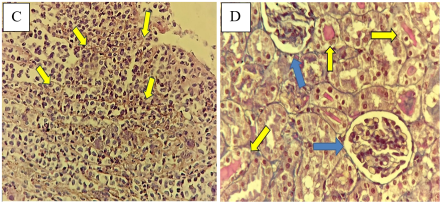 Fig. 10 (A) Sham group has normal renal tubule histology (blue arrow); stained with hematoxylin and eosin (HandE) X400. (B) IRI group; kidney tubules with score four including focal tubular necrosis highlighted by cytoplasmic cyanophilic staining including the disappearance of brush borders, cytoplasmic eosinophilia, dilated tubules and hemorrhage>75% (yellow arrow), stained with trichrome X400. (C) D. W group, kidney tubules with score four damage. Cytoplasmic eosinophilia, dilated tubules, cast formation, and hemorrhage (yellow arrows); stained with HandE X400. (D) Tirzepatide group, kidney tubules with damage score one associated with occasional intratubular protein casts (yellow arrows) with preserved renal corpuscle and tubules (blue arrows); stained with trichrome X400.