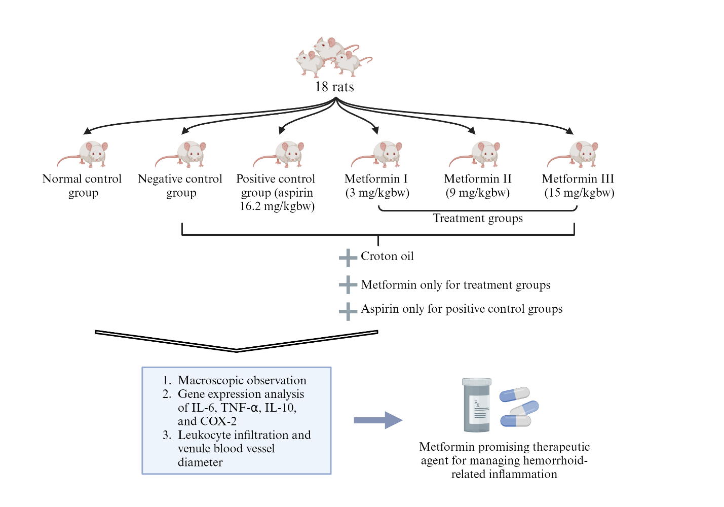 Methods: Rats were assigned to six groups: normal control, negative control (hemorrhoid-induced without treatment), positive control (hemorrhoid-induced and treated with aspirin), and three metformin-treated groups receiving 3 mg/kg, 9 mg/kg, and 15 mg/kg body weight doses. Metformin's effects were assessed through macroscopic observation, qPCR analysis of IL-6, TNF-α, IL-10, and COX-2 gene expression, and histopathological examination of leukocyte infiltration and venule diameter.