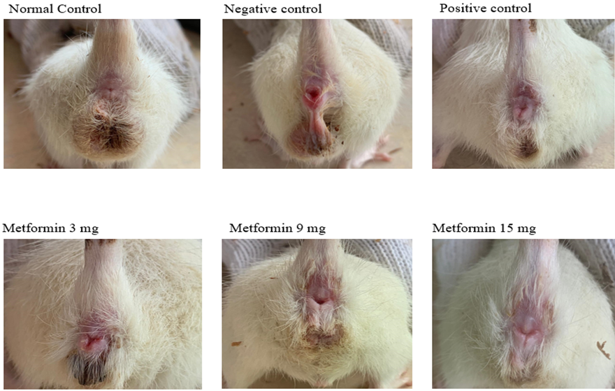 In this study, we divided the experimental rats into six groups, each containing three rats. The groups included three metformin-treated groups (receiving 3 mg/kg, 9 mg/kg, and 15 mg/kg doses), a normal control group, a negative control group (hemorrhoid-induced without treatment), and a positive control group (hemorrhoid-induced and treated with aspirin). Our findings on the macroscopic observations of hemorrhoid-induced rats, particularly the dose-dependent reduction in inflammation with metformin, are consistent with previous research on its anti-inflammatory properties. Metformin's efficacy in reducing inflammation has been documented in models of colitis, where similar reductions in redness and swelling were observed upon metformin administration [24]. This further supports the hypothesis that metformin’s anti-inflammatory mechanism may be generalized across different inflammation-related conditions, including hemorrhoids (fig. 2).