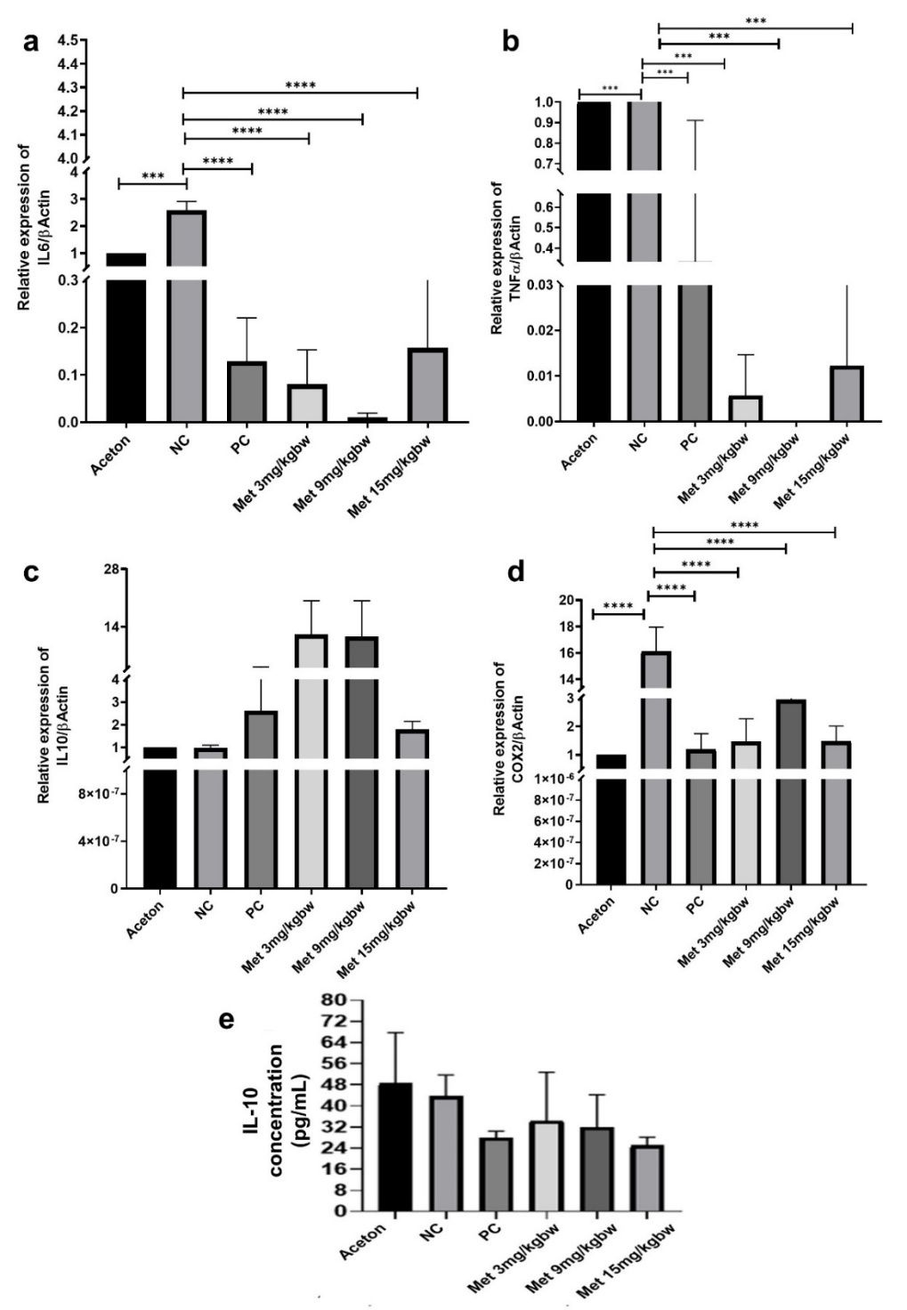 The analysis of IL-6, TNF-α, IL-10, and COX-2 gene expressions was conducted using qPCR. The statistical analysis revealed significant differences among the groups for IL-6 expression (fig. 3A). The negative control group showed a substantial increase in IL-6 expression (158.7%), while the positive control exhibited an 87.1% reduction. Metformin treatment resulted in a marked reduction, particularly in the 9 mg/kg dose group, which showed a 99% reduction, suggesting that metformin, especially at a dose of 9 mg/kg, is effective in reducing IL-6 expression.