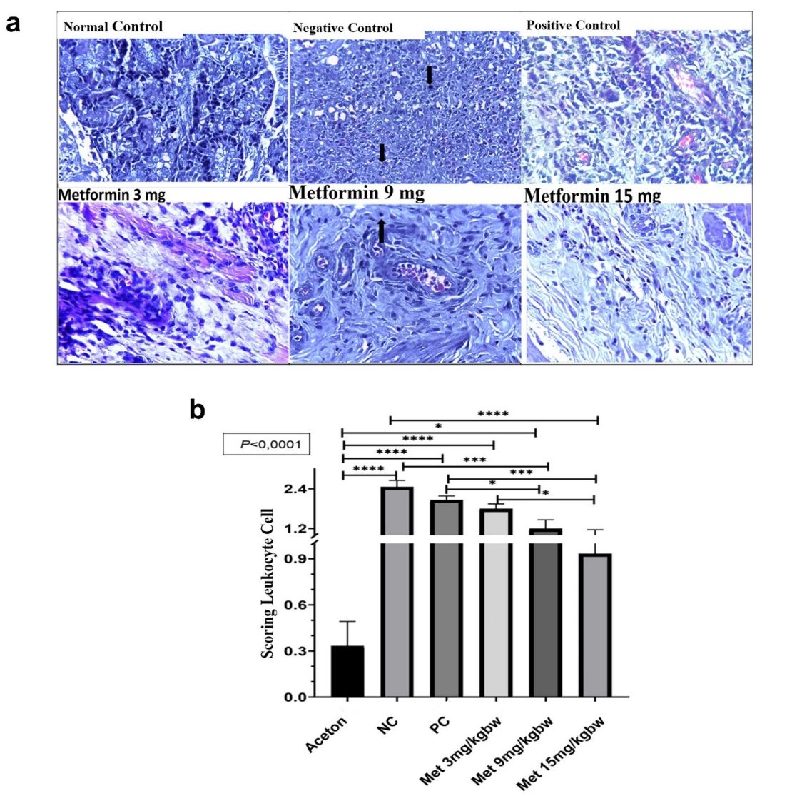 Fig. 4: Metformin treatment reduced leukocyte infiltration. (A) Representative images of leukocyte infiltration at 40x magnification using a light microscope. (B) Scoring of leukocyte cell infiltration in each group. All results are shown as mean±SD of triplicate experiments in each of the two independent experiments