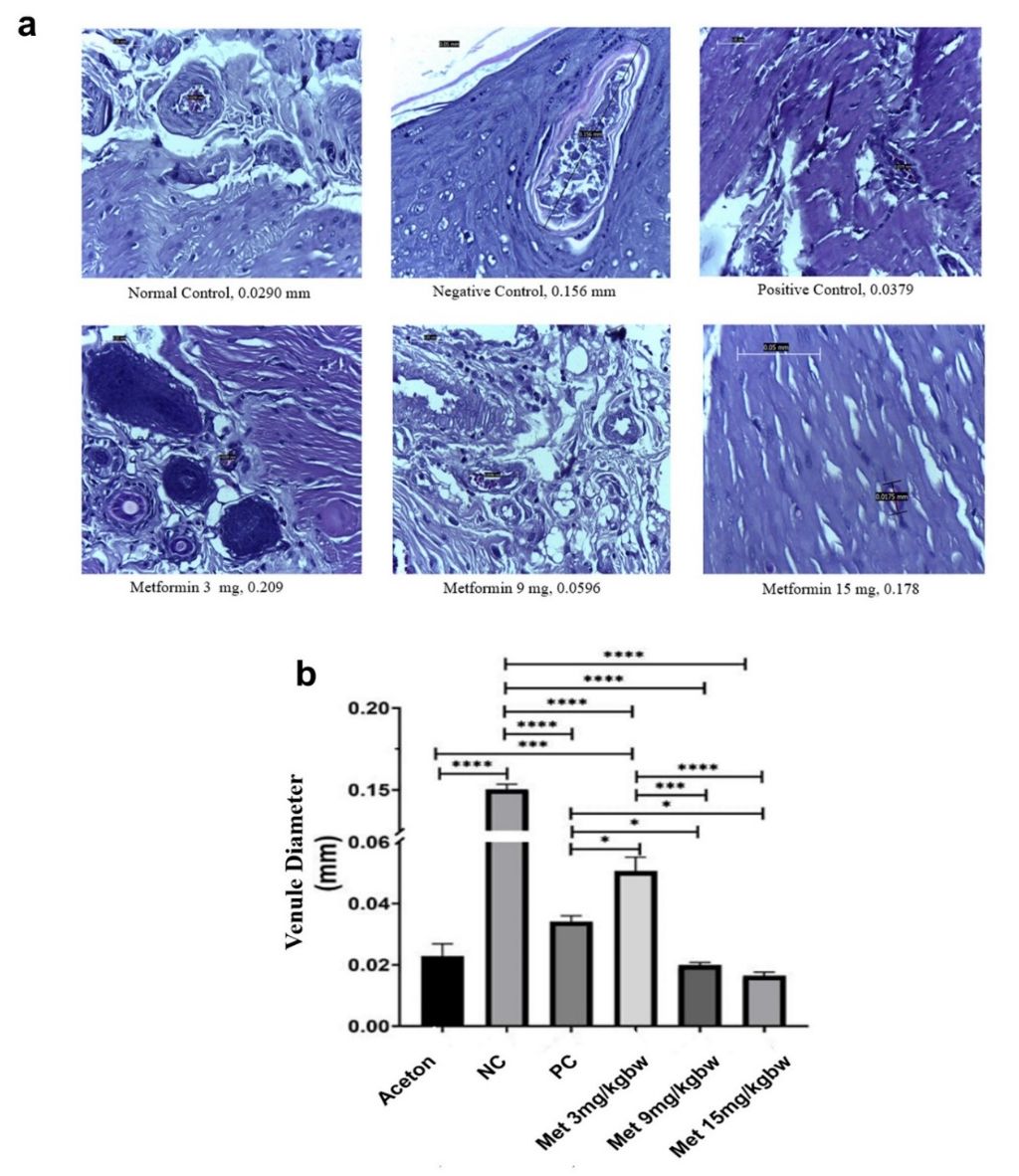 The data demonstrated that the negative control group had the largest venule diameter among all groups, confirming the presence of inflammation. The group treated with 3 mg/kg of metformin had a venule diameter 49.72% larger than the normal control, indicating only partial mitigation of vasodilation. The positive control group, treated with aspirin, showed a venule diameter 20.75% larger than the normal control, suggesting moderate anti-inflammatory effects. In contrast, the group receiving 9 mg/kg of metformin exhibited a 7.92% reduction in venule diameter compared to the normal control, indicating a significant decrease in vascular inflammation. The 15 mg/kg metformin group demonstrated the greatest effect, with a 47% reduction in venule diameter, suggesting that higher doses of metformin are more effective in reducing vascular inflammation [25, 26]. Moreover, the contrast between metformin’s effect and aspirin’s suggests that metformin may have a more targeted action on vascular inflammation in hemorrhoid models. These insights add to the growing evidence that metformin could be a valuable treatment for vascular complications beyond its traditional use in diabetes management.