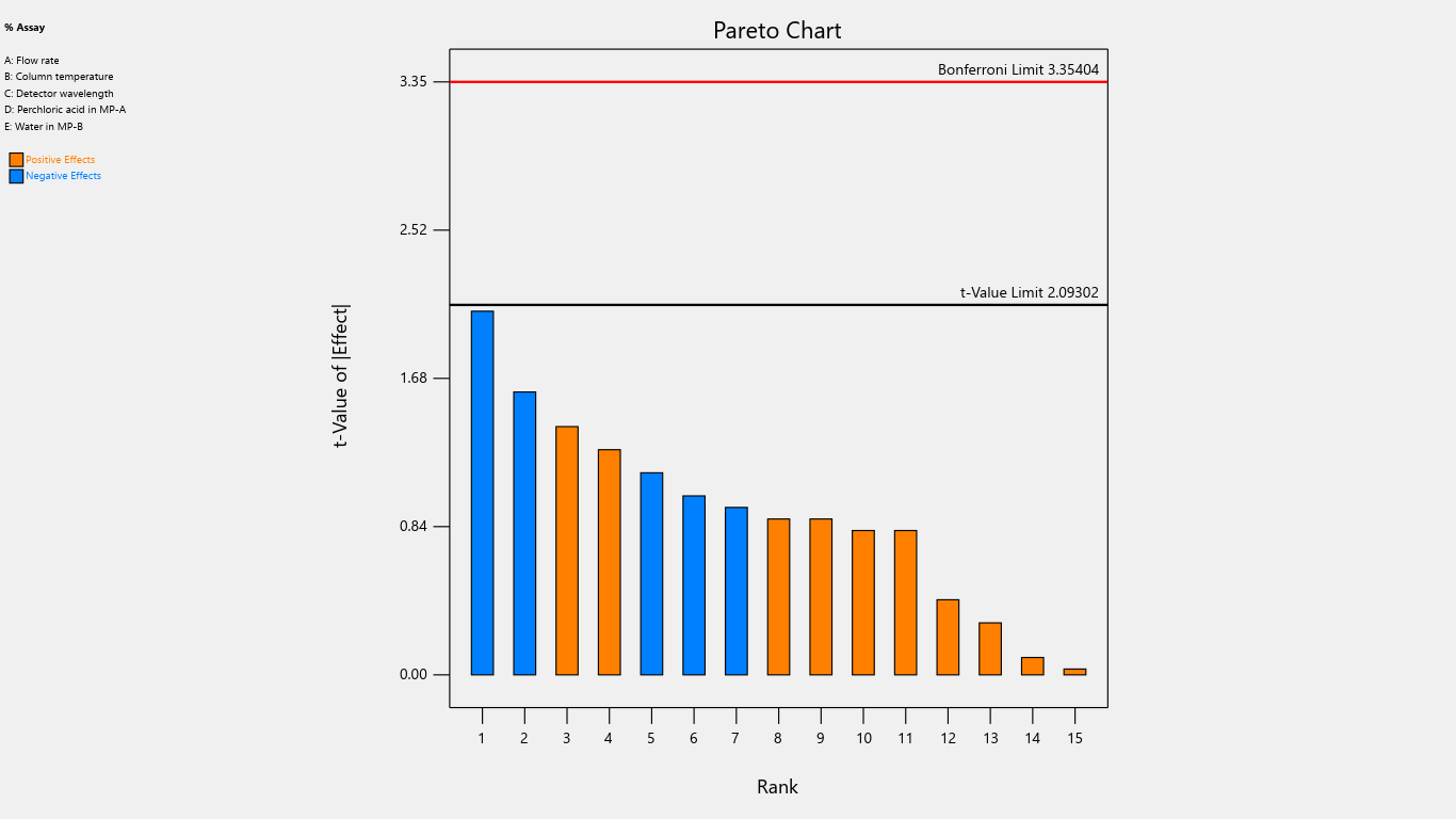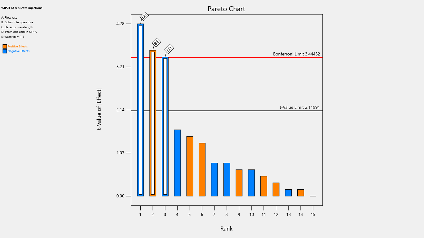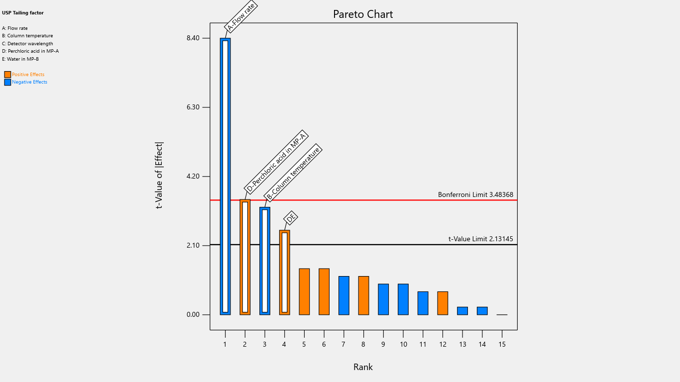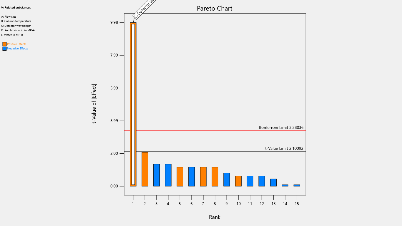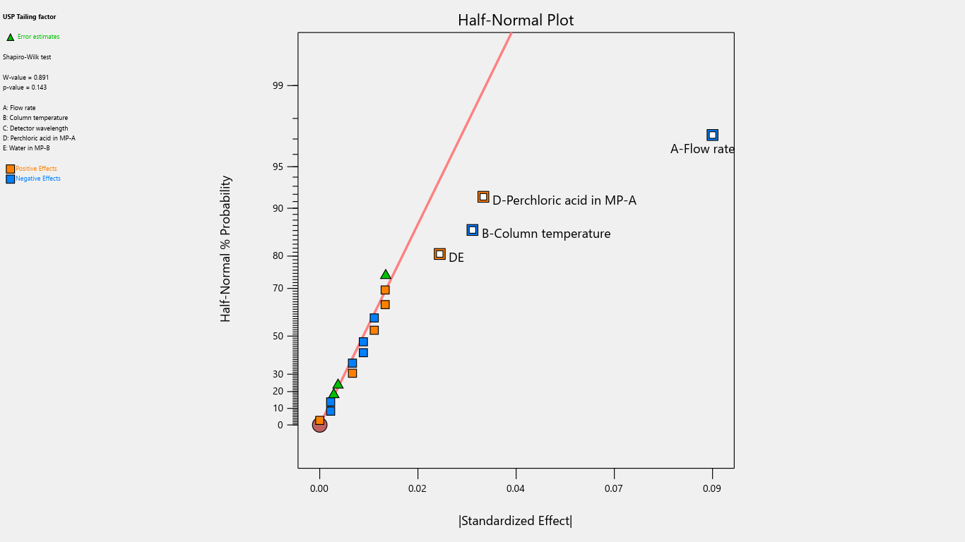The factors (flow rate, column oven temperature, detection wavelength, volume of perchloric acid in mobile phase-A, change in a minor component in mobile phase-B) interaction effects were evaluated on the following responses (tailing factor, theoretical plates, resolution, % RSD of replicate standard injections, % assay, % related substances, retention time).