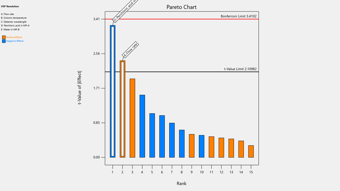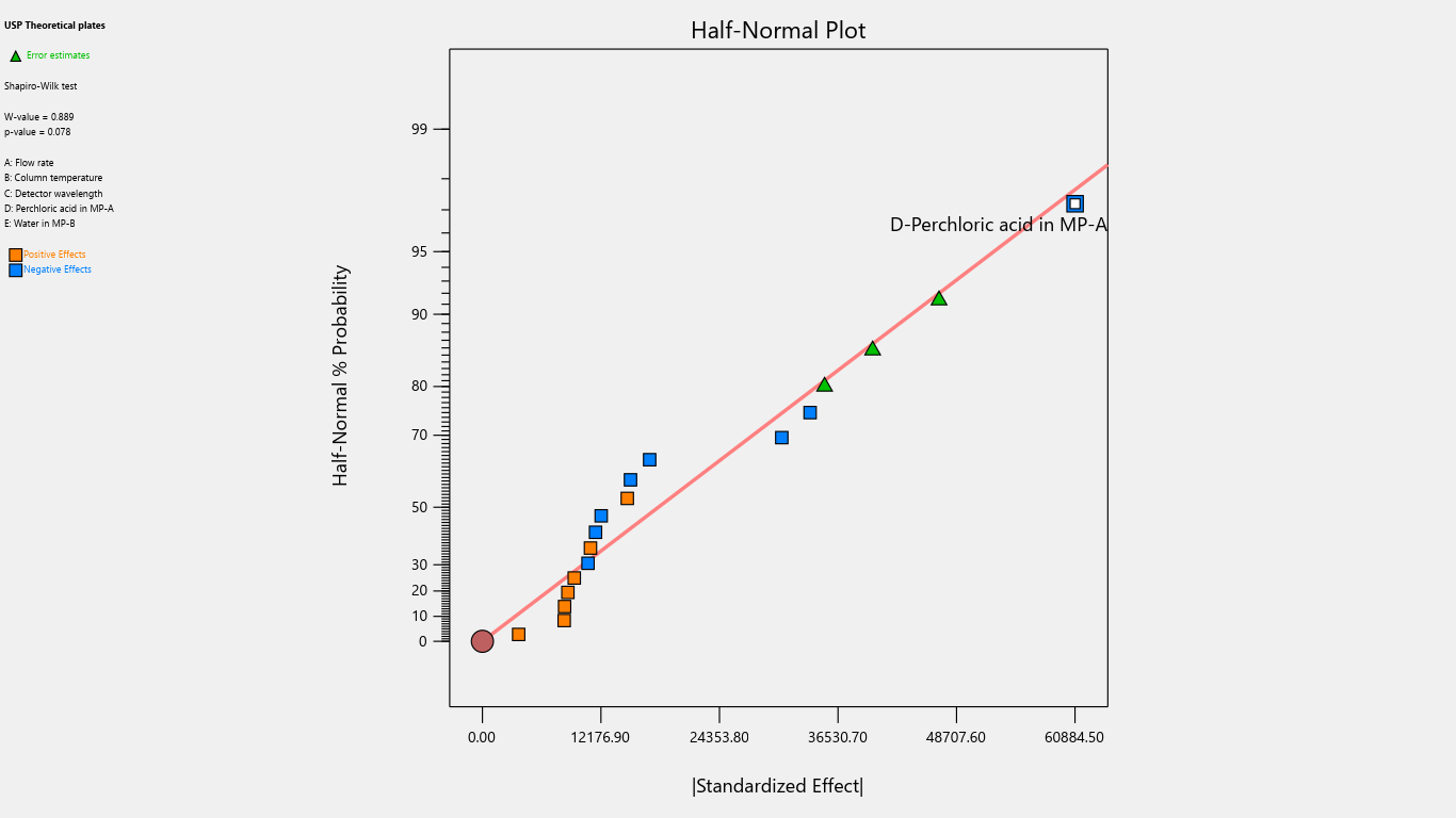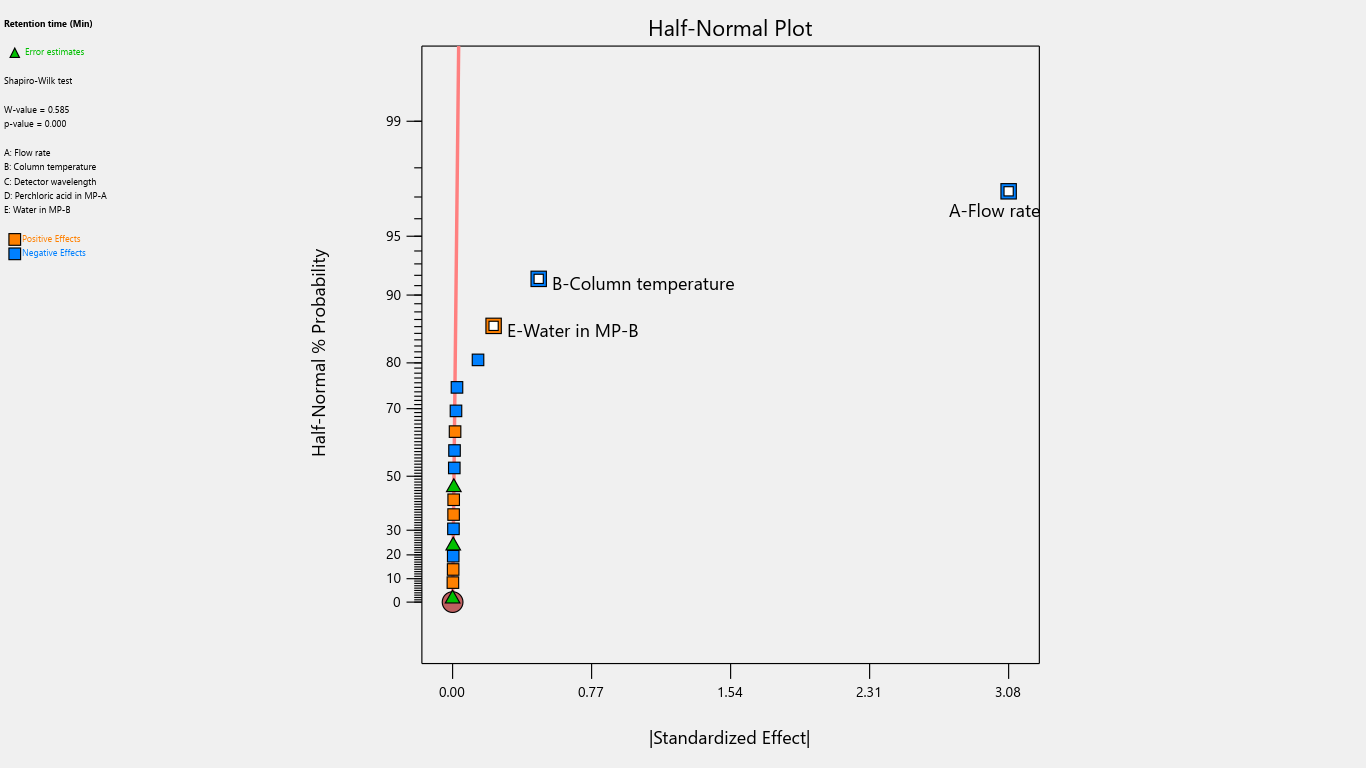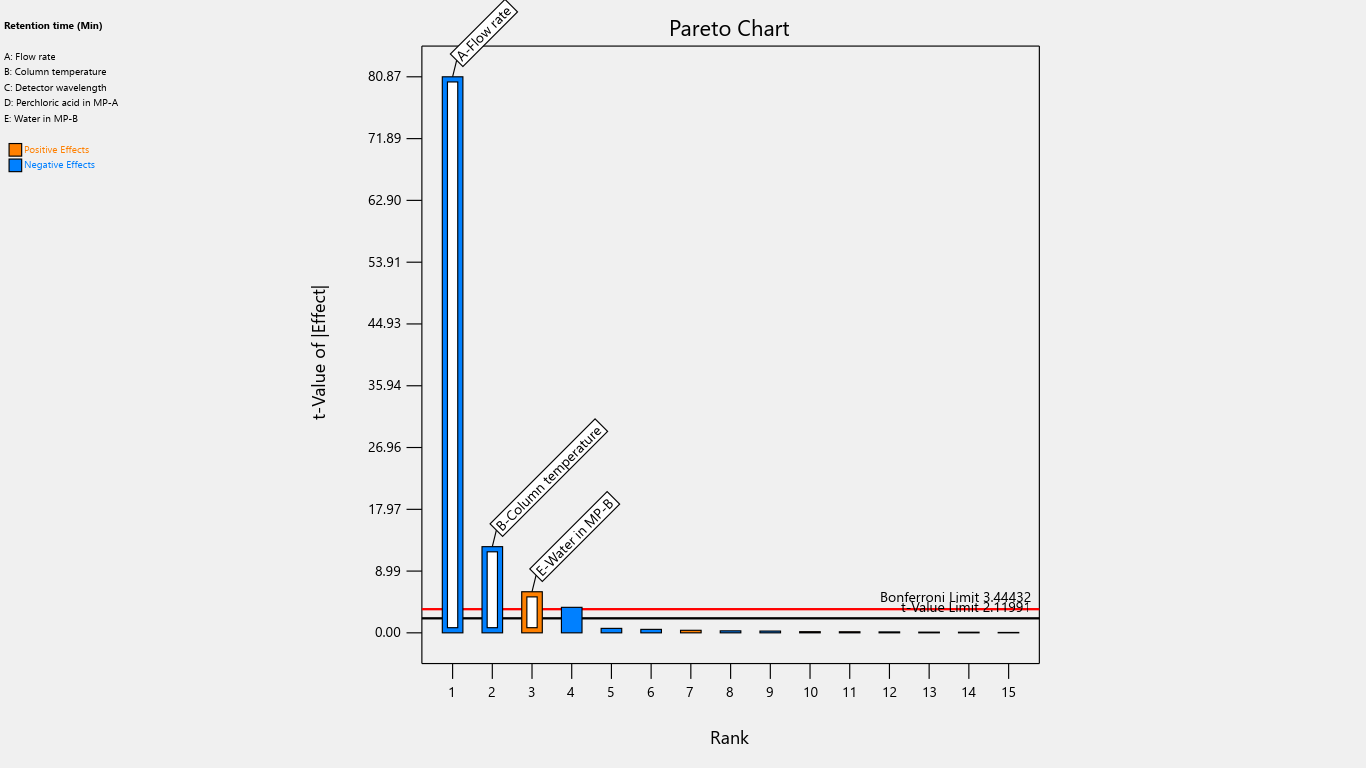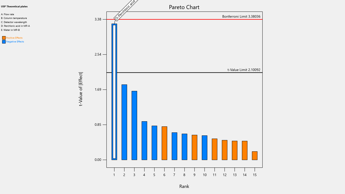The factors (flow rate, column oven temperature, detection wavelength, volume of perchloric acid in mobile phase-A, change in a minor component in mobile phase-B) interaction effects were evaluated on the following responses (tailing factor, theoretical plates, resolution, % RSD of replicate standard injections, % assay, % related substances, retention time).