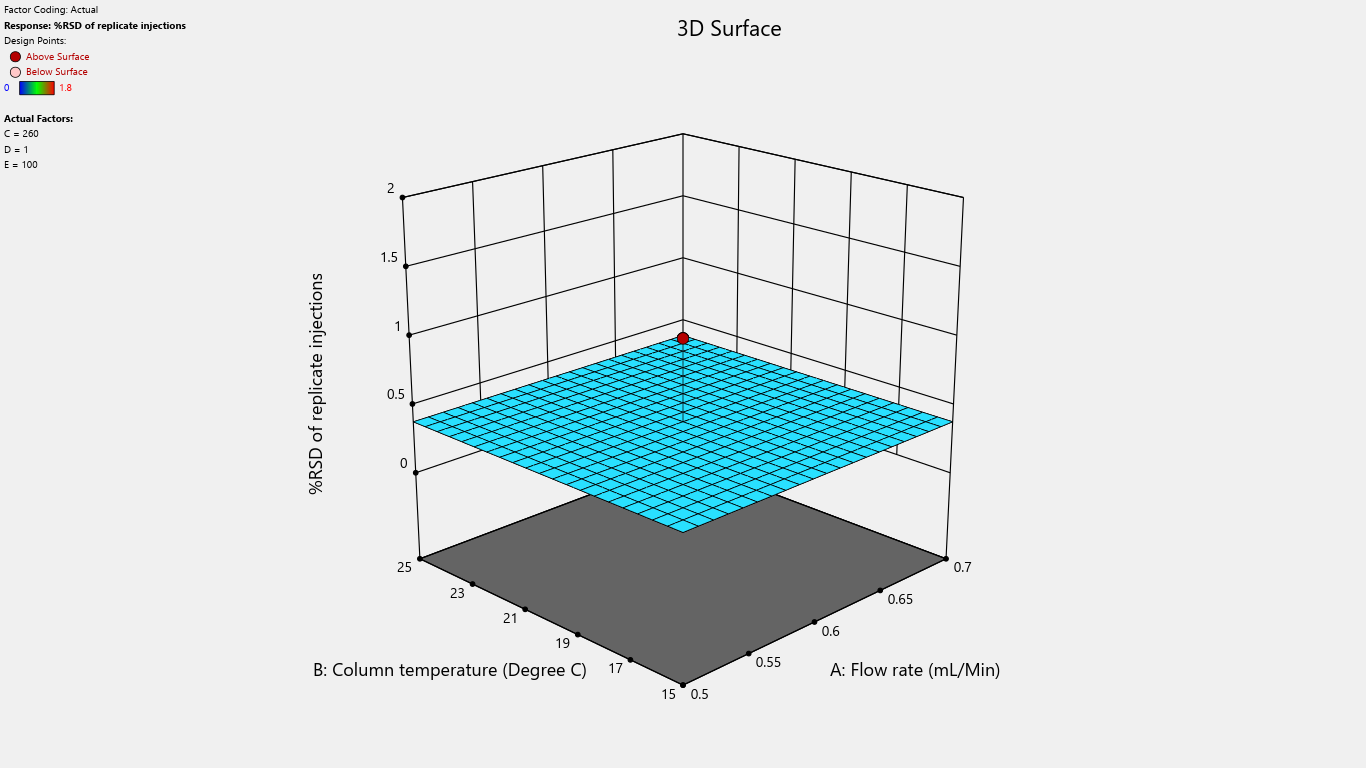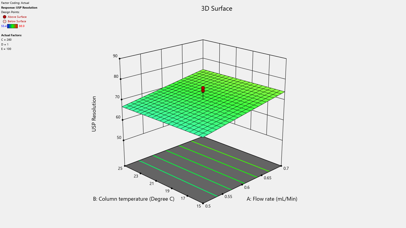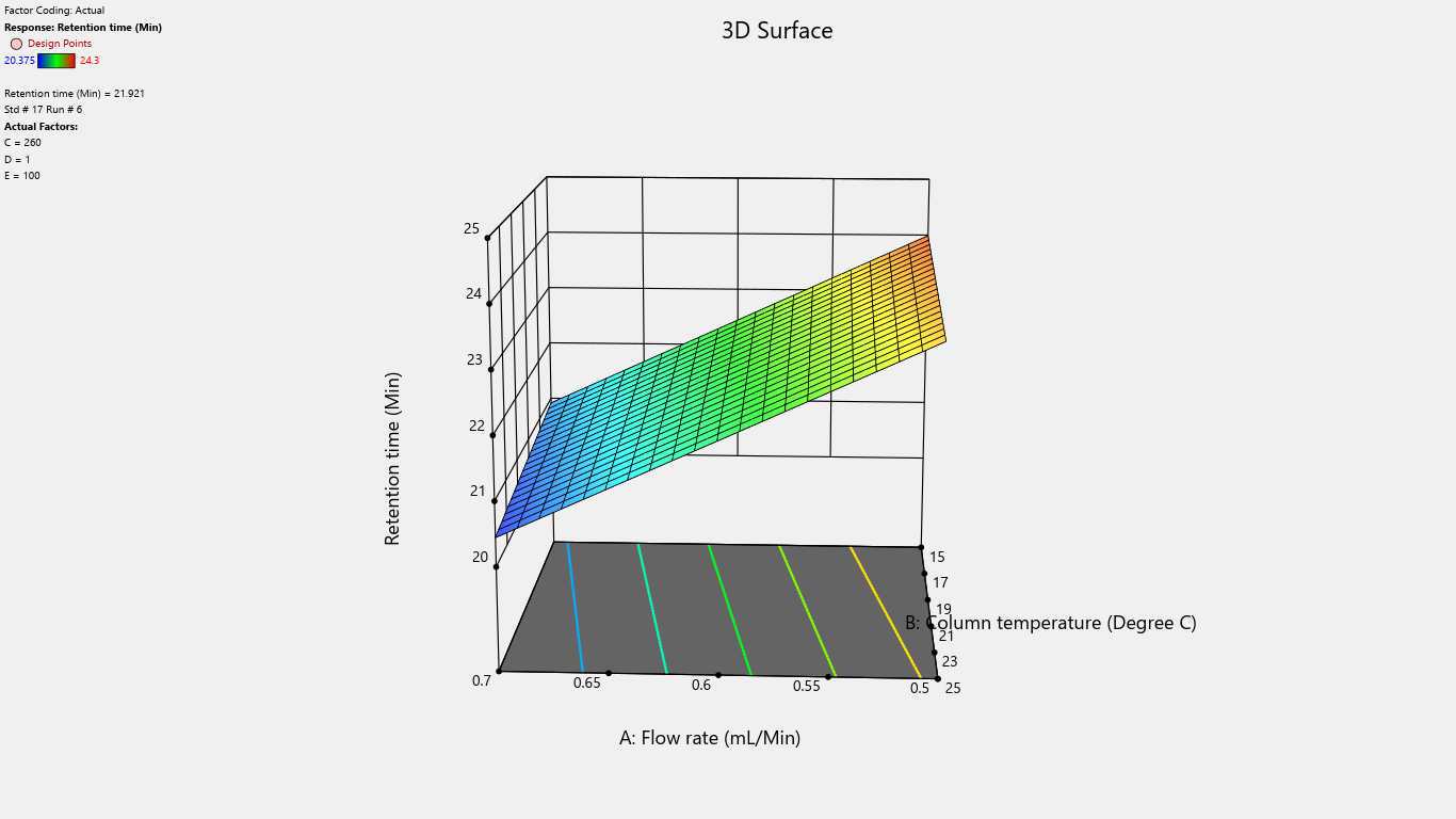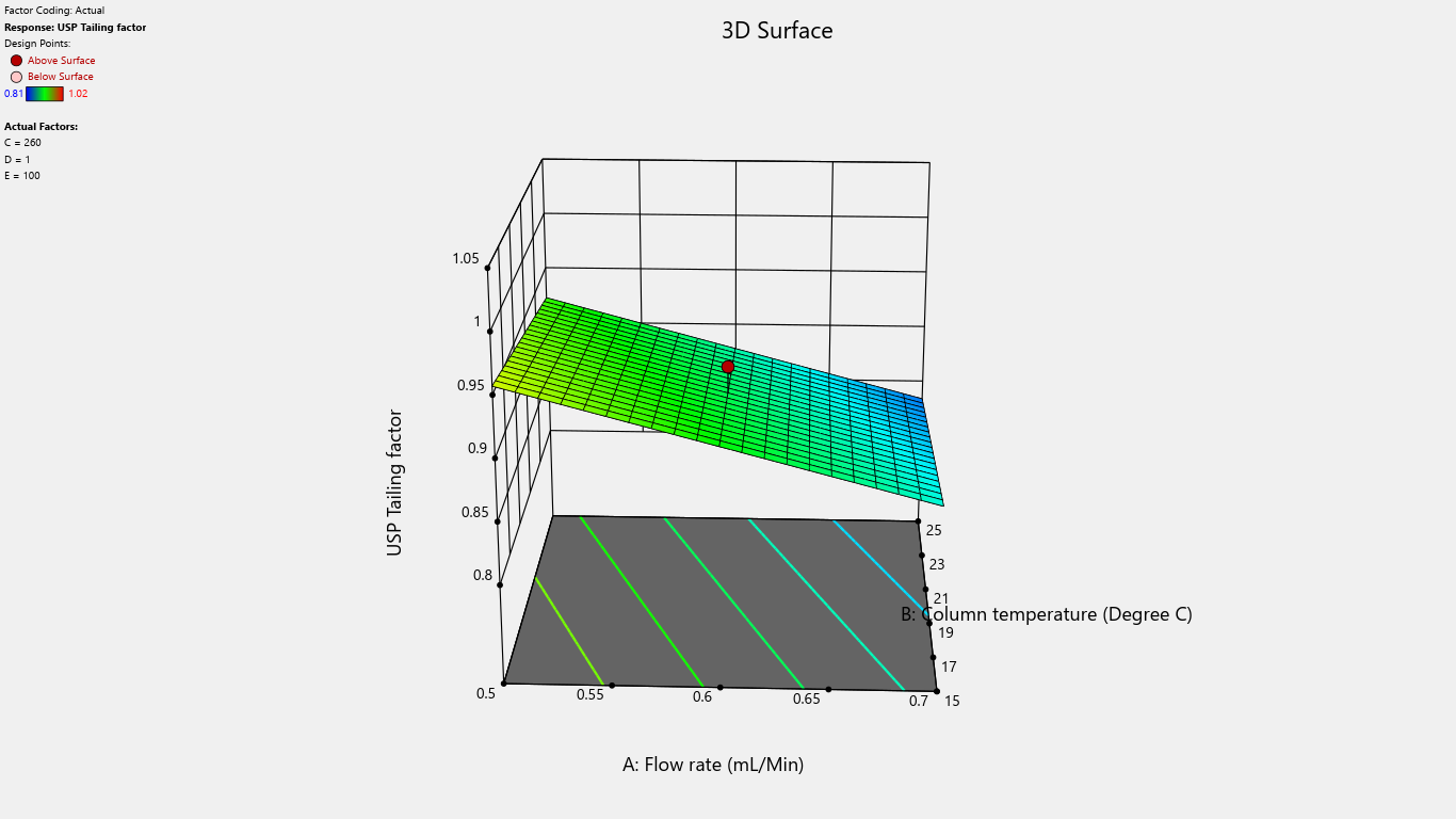 Historically, the pharmaceutical industry relied on the traditional "Quality by Testing" (QbT) approach. This method focused primarily on end-product testing to ensure quality and performance, with a limited understanding of the product, process, and critical process parameters. In recent years, regulatory bodies have shifted their focus to ensuring the quality, safety, and efficacy of products. To achieve this, they are promoting the adoption of “Quality by Design” (QbD), a science-based approach that emphasizes product and process understanding and “Process Analytical Technology” (PAT), tools that enable real-time monitoring and control of processes. By implementing QbD and PAT, manufacturers can reduce process variation, develop effective process control strategies, and ultimately produce better products. It means the design of specifications of raw material, packing material, and finished goods and the formulation design, process design, process parameters design, analytical method design, etc., is to be considered or designed scientifically by using the relevant and effective scientific tools i. e. Design of Experiments (DoE), to ensure that quality is integrated throughout the entire product lifecycle. QbD has become a widely adopted paradigm in the pharmaceutical industry, supplanting traditional approaches. By integrating QbD principles, manufacturers can minimize product variability and mitigate associated risks. In the context of product development, AQbD is implemented through a systematic process involving identifying critical analytical attributes, comprehensive risk assessment, and defining the design space. A stability-indicating HPLC method was developed for the simultaneous quantification of assay and degradation products of molnupiravir. This method employed a Quality-by-Design (QbD) approach [31, 32], utilizing Design Expert software (v13) to optimize the chromatographic conditions. The influence of five critical factors was systematically evaluated, including flow rate, column oven temperature, detection wavelength, perchloric acid volume in mobile phase-A, and purified water in mobile phase-B. The interactions between the key factors and their impact on various response factors were investigated by conducting twenty experimental runs as suggested by the software. The following response factors were assessed, and these were tailing factor, theoretical plates, resolution, % RSD of replicate standard injections, % assay, % related substances, and retention time.