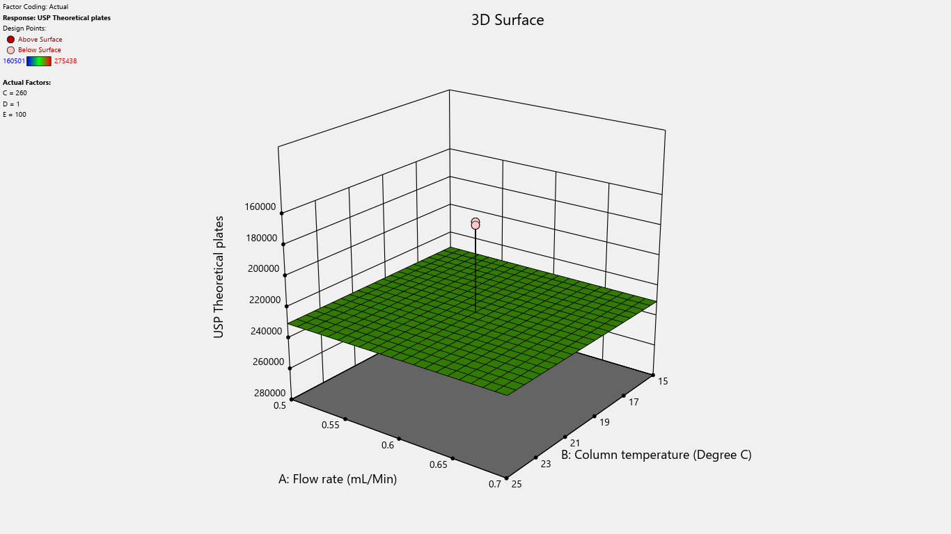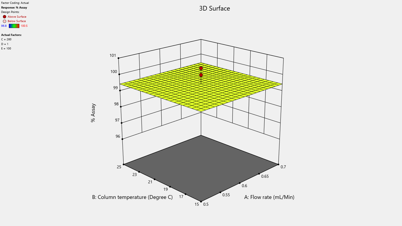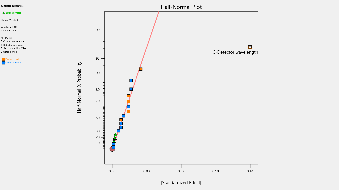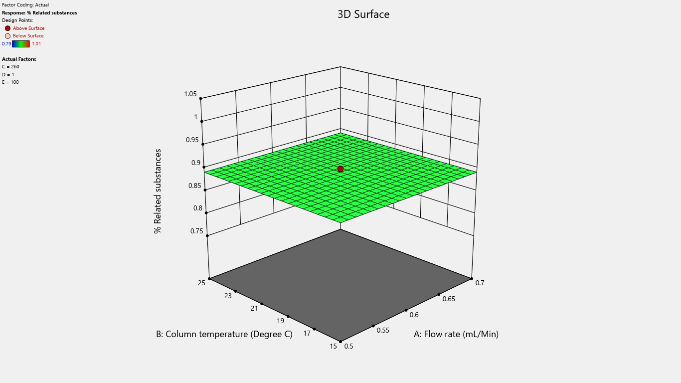 Results indicated that the center point of the design space fell within acceptable limits, demonstrating a robust region where intentional variations in method parameters do not significantly affect % assay. Notably, detection wavelength changes significantly impacted % related substances, advising against wavelength adjustments. Importantly, none of the investigated method parameters showed a practically significant effect, ensuring the method's reliability and minimizing the risk of failure during subsequent validation testing. Refer to table 4 for the Coefficients table and fig. 2 to fig. 22 Half-Normal plot, Pareto charts and 3D surface response plots.