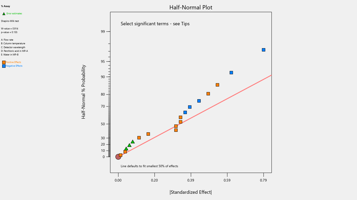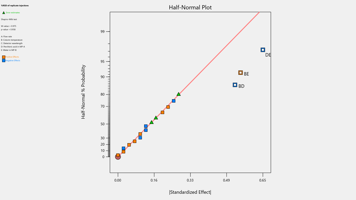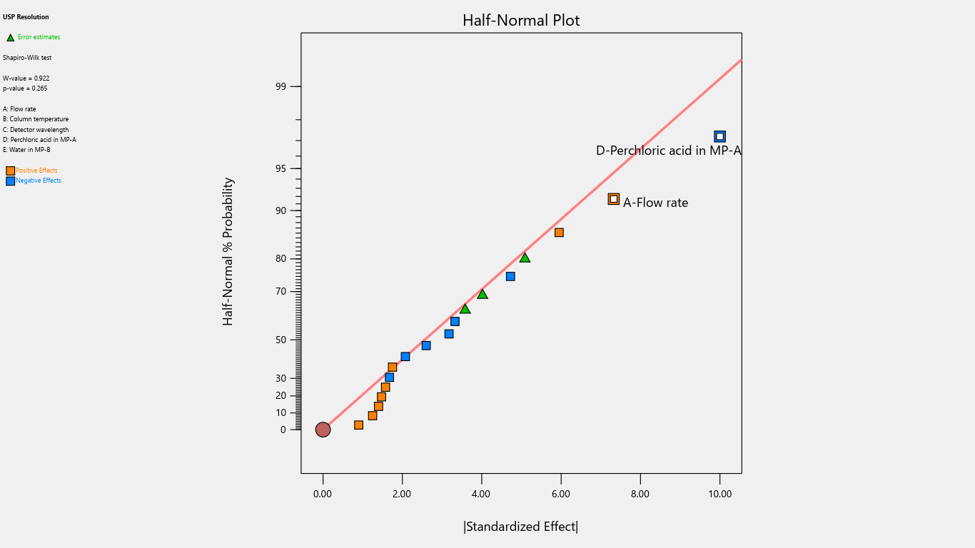 Critical Method Material Attribute (CMMA) refers to any material variation that can impact a Critical Analytical Attribute (CAA). As such, it is essential to monitor or control CMMAs to guarantee the desired quality standard. Although material characteristics – such as reagent purity, column stationary phase properties, and glassware quality- significantly affect critical analytical attributes [25, 26], the subsequent DoE investigation focused on other factors, excluding the following material attributes. These are, the high purity grade of solvents and reagents were used during the experiments and these grades remained unchanged throughout the experiment. The effect of column stationary phase variations, having been already characterized during intermediate precision studies, was considered controlled. Glassware type differences (amber/clear), having been previously investigated for solution stability, were considered controlled. Given prior evaluation in separate investigations, these attributes were deliberately excluded from the DoE scope.