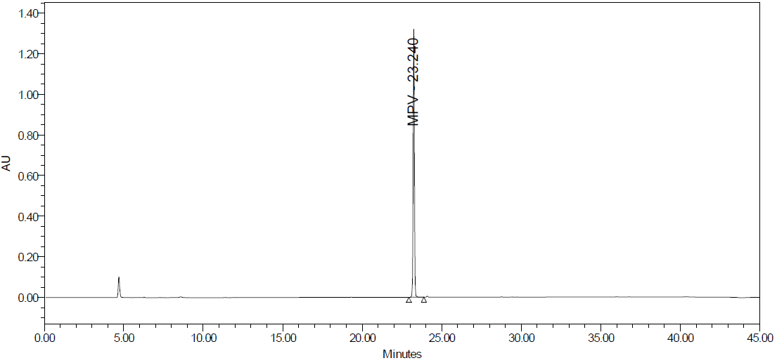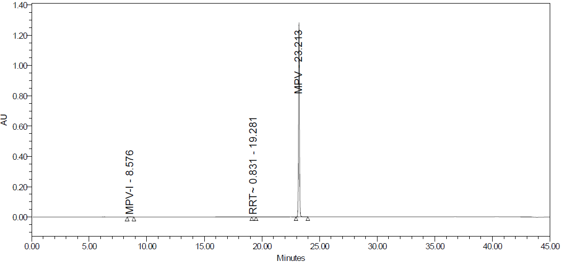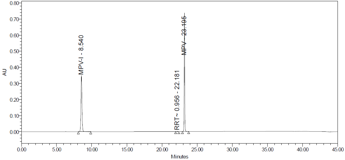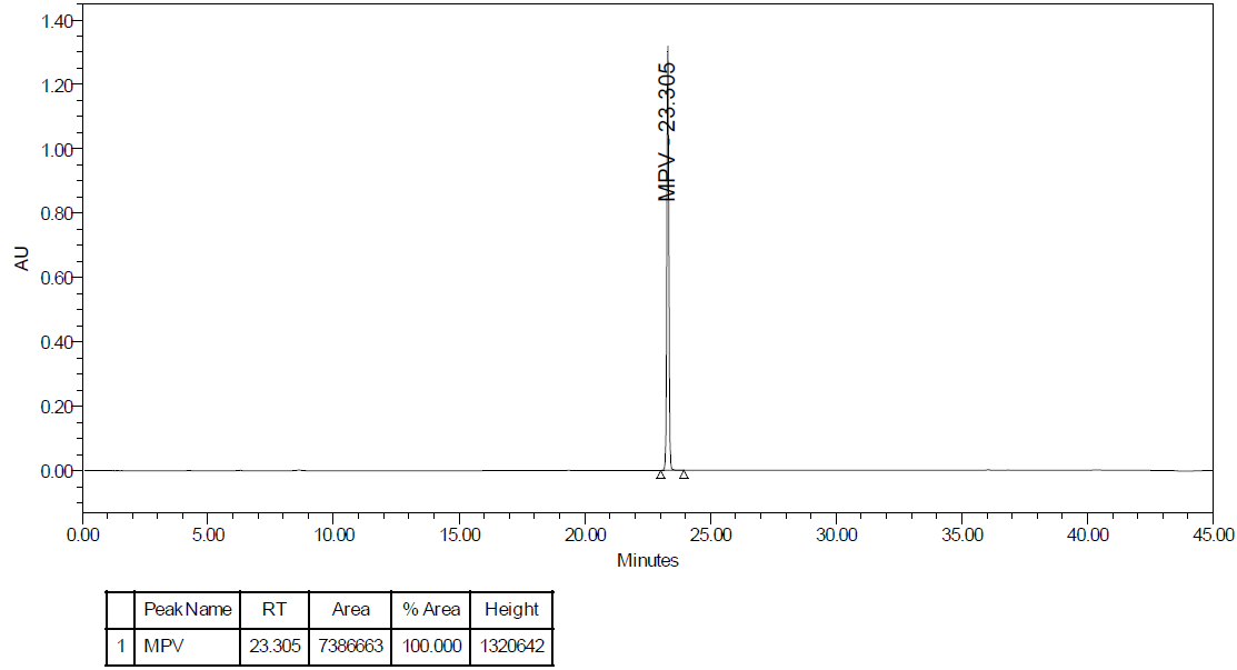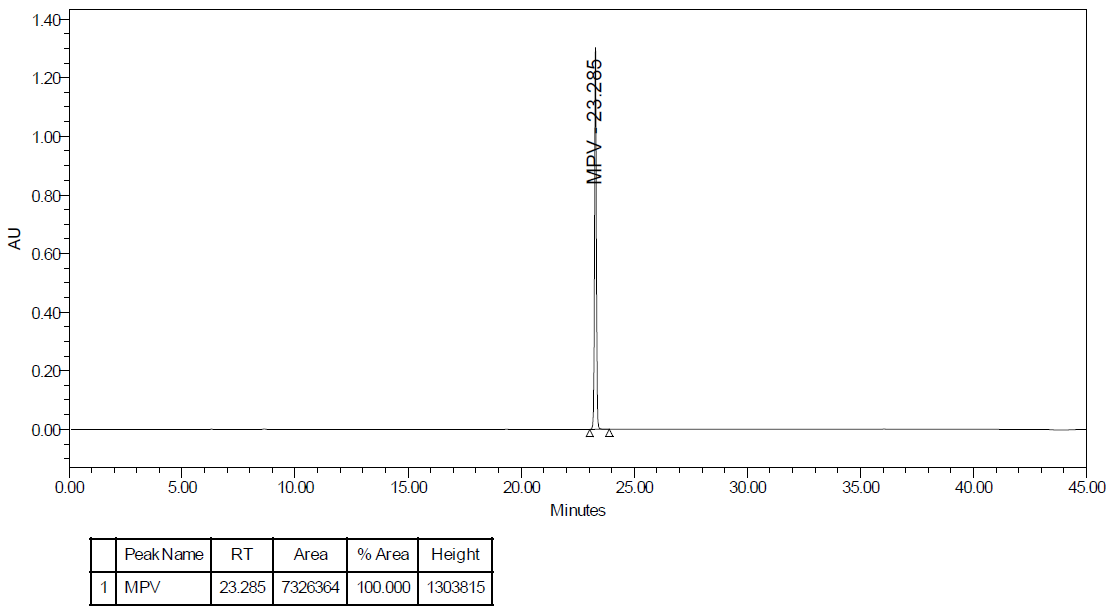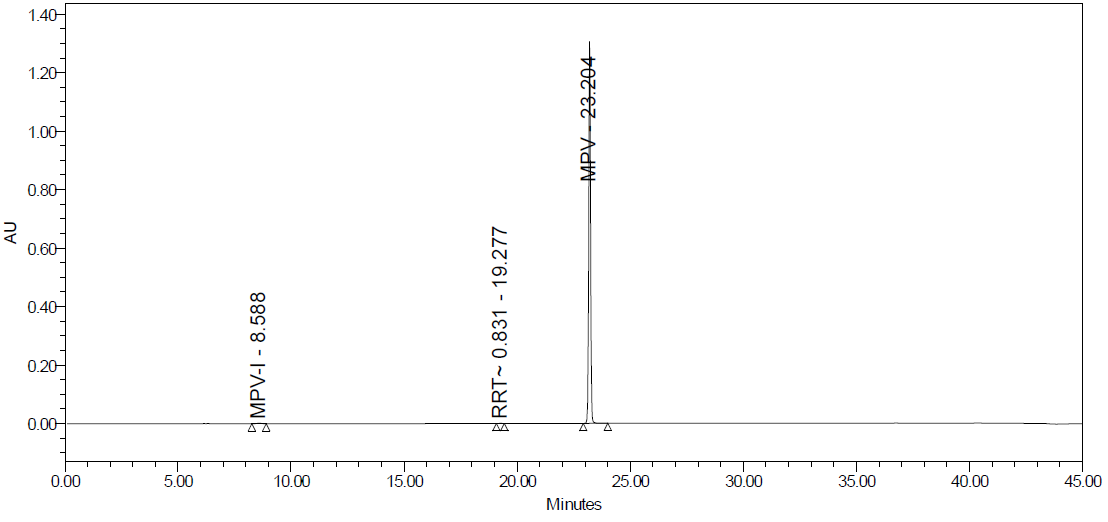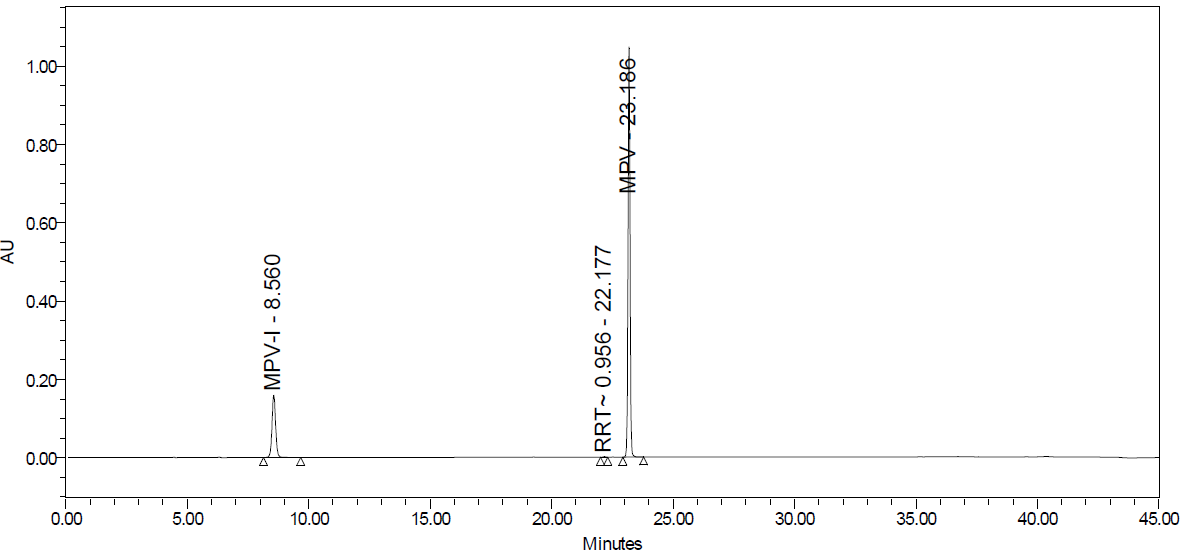 Weighed accurately about 40 mg of MPV sample and transferred it in a 100 ml volumetric container. After the addition of 90 ml diluent, sonicated the mixture till the MPV was completely dissolved in the solution. The solution was made up to the mark with diluent mixed well to achieve the 0.40 mg/ml concentration.