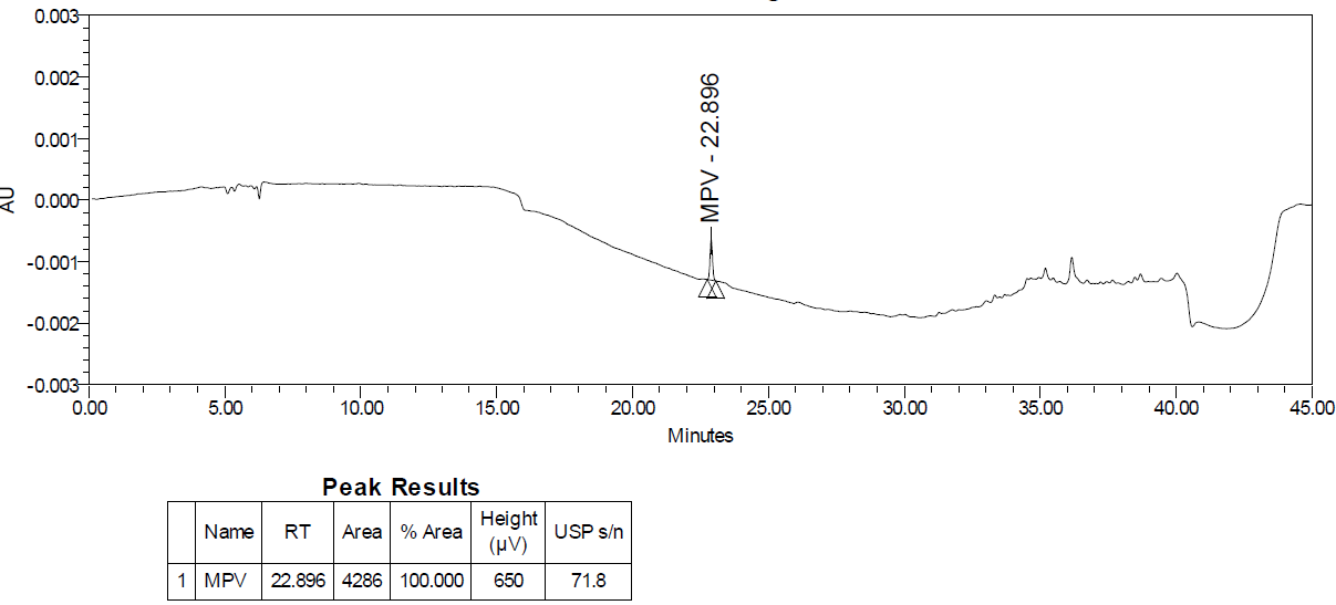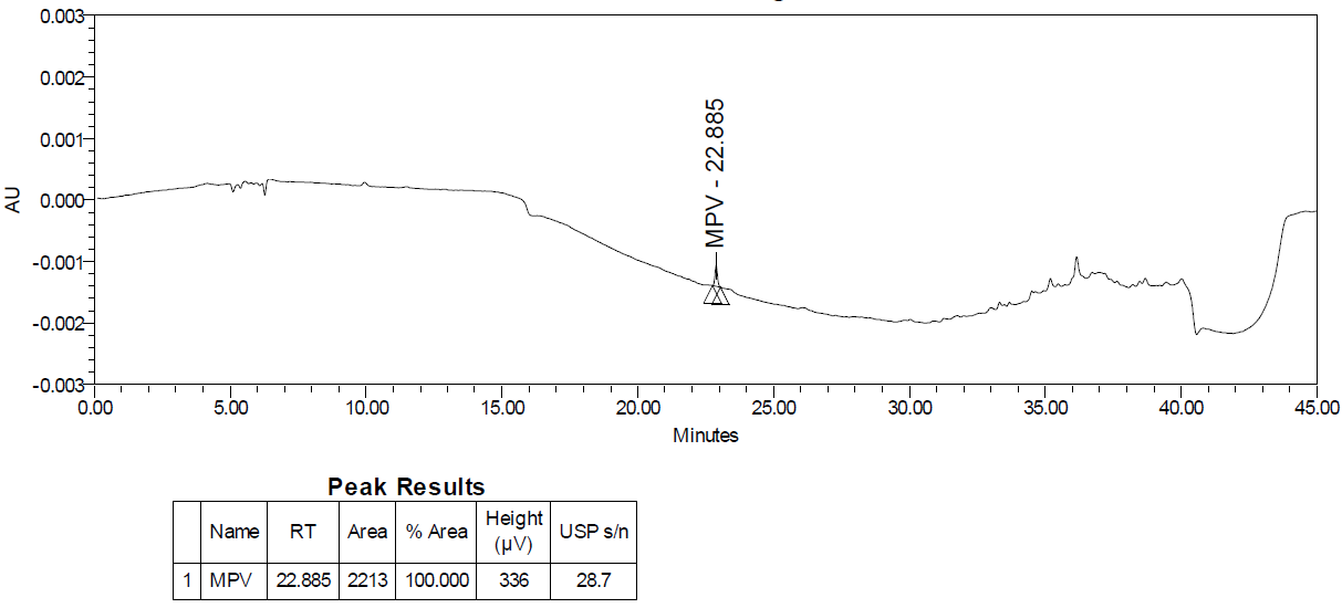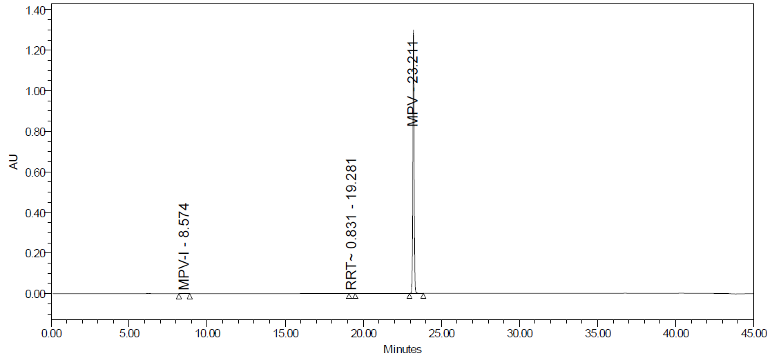 | 2. | Specificity | No interfering peak was observed at the retention time of MPV in the blank. The peak due to MPV was found well resolved from other peaks. The resolution between the major degradant and MPV peak was 76.1 The purity angle is less than the purity threshold for MPV in Empower 3 software. |