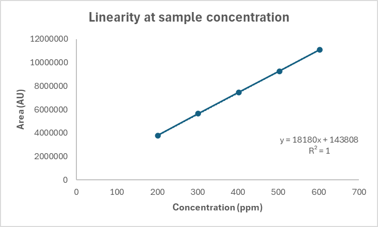 | 5. | Linearity | Correlation coefficient (r) = 0.9999 Y-Intercept = 143808 Slope = 18180 Residual standard deviation = 16707.4 Residual sum of squares = 837409574.3 |