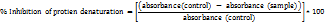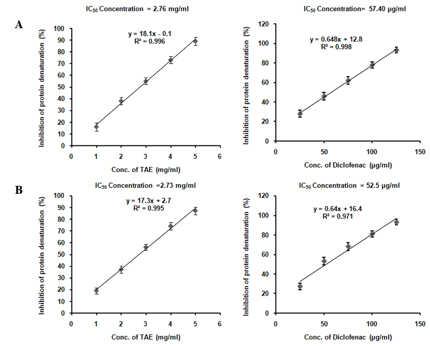 Fig. 3: Protein denaturation inhibition in (A) BSA and (B) egg albumin using TAE