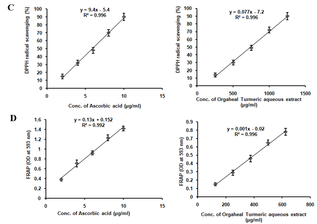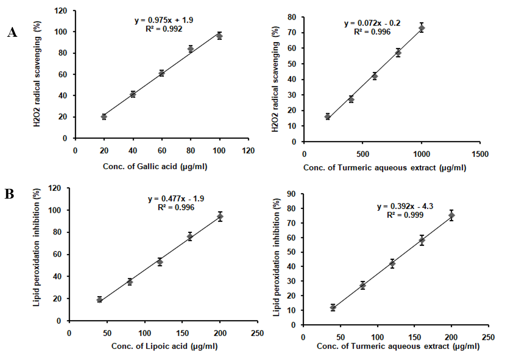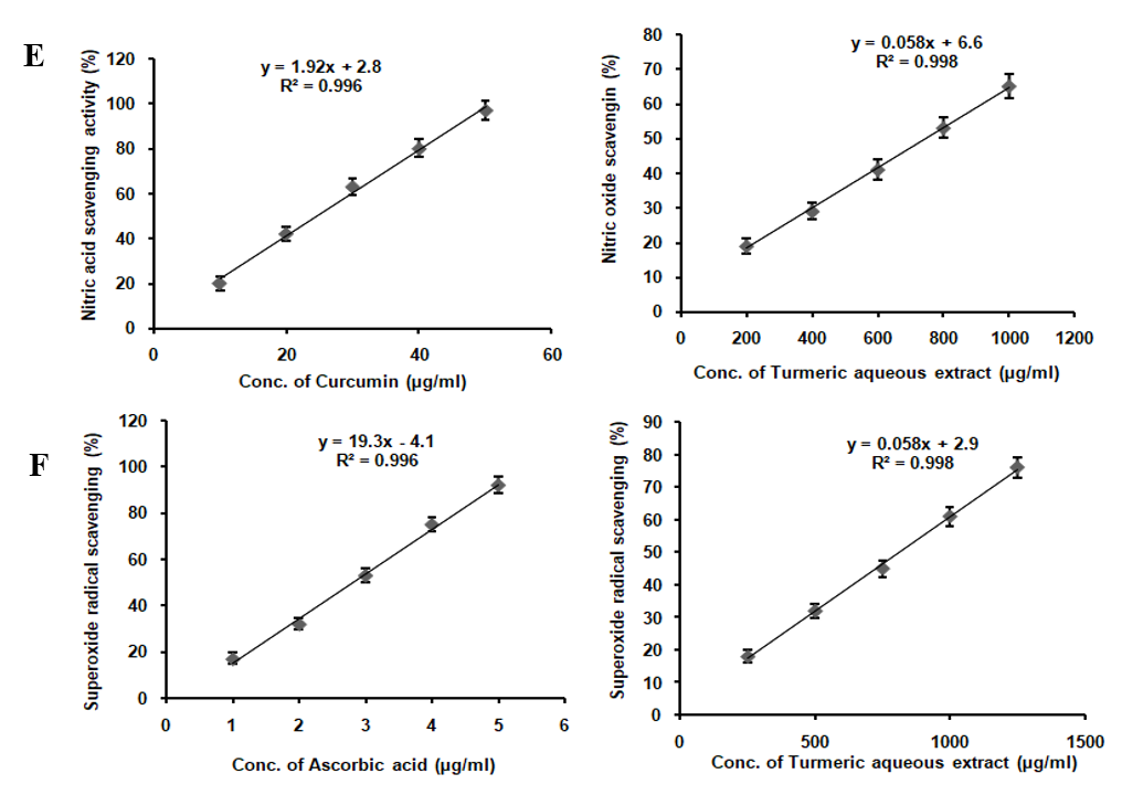 TAE enriched with curcumin, boswellic acids, gingerols, and piperine, demonstrates a broad spectrum of antioxidant activities, albeit with varying degrees of potency. It effectively scavenges DPPH radicals, nitric oxide, superoxide radicals, and hydrogen peroxide radicals, while also inhibiting lipid peroxidation and significantly increasing FRAP assay absorbance from 0.25 to 0.93 at 593 nm. However, it lacks activity against hydroxyl radicals (table 1). Compared to the standards ascorbic acid, curcumin, lipoic acid, and gallic acid, TAE exhibits lower potency, indicating milder antioxidant effects. The absence of hydroxyl radical scavenging is attributed to the inherent reactivity of its bioactive compounds, as curcumin and piperine lack the structural features required to neutralize these highly reactive radicals. These results suggest that TAE, with its bioactive compounds, holds potential as a multi-functional antioxidant supplement, particularly in applications where moderate antioxidant effects are desirable or when used in combination with other antioxidants to enhance efficacy (fig. 2).