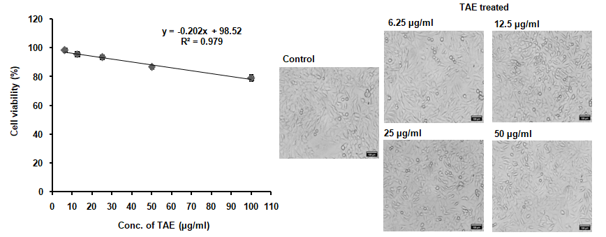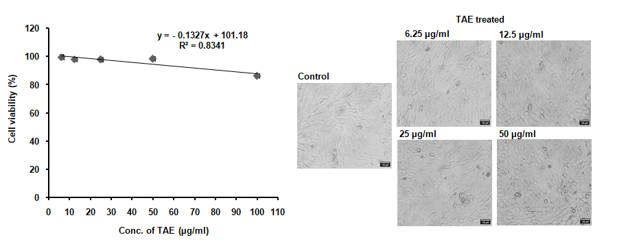 To conduct a cell viability test, 200μl of cell suspension was seeded in a 96-well plate and incubated for 1d, add the test agents (TAE) to the appropriate wells and incubate for another 1d. Then, remove spent media and add MTT reagent to each well. Cover the plate with aluminum foil and incubate for 3h. After incubation, add 100μl of DMSO to each well after removing the MTT reagent. Measure the absorbance at 570 nm using a plate reader and calculate cell viability (%) using the formula.