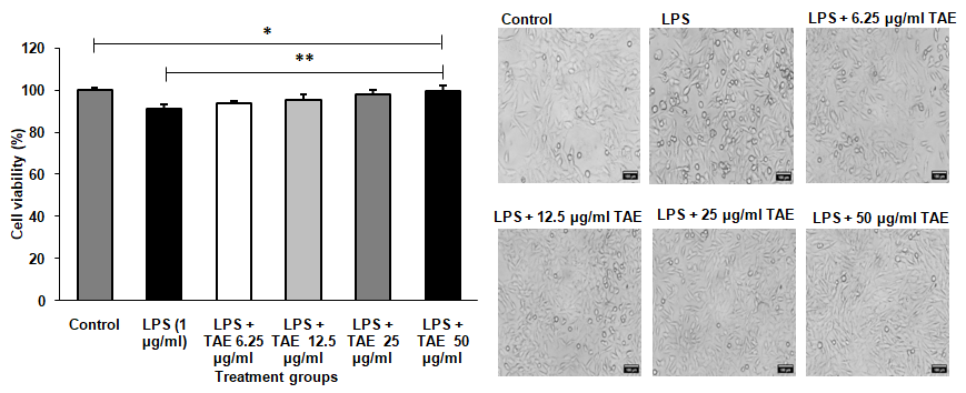 To evaluate the NO inhibition, 200 μl of cell suspension was seeded into a 96-well plate and grown for 1d. Afterward, treat the cells with various concentrations of TAE and 1 µg/ml of LPS and incubate them for 1d in a CO2 atmosphere. Following the incubation period, collect the culture supernatant and measure the NO levels using a commercial kit. EZAssay TMNO Estimation Kit.
