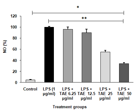 Fig. 6: Inhibitory effect of TAE on LPS-induced NO production. The data are shown as mean±SD (n=3), with *P<0.001 indicating significance compared to the control group and **P<0.001 indicating significance between different groups