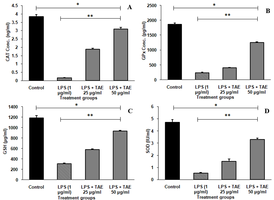 Fig. 7: Endogenous antioxidant levels of TAE in Raw 264.7 cells (A) Catalase, (B) Glutathione peroxidase, (C) Glutathione and (D) Superoxide dismutase in SH-SY5Y Cell line, The data are expressed as mean±SD (n=3). Significance is indicated by *P<0.001 compared to the control group and **P<0.001 for comparisons between groups