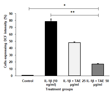 Cells seeded in a 96-well plate and incubated for 24h. They are divided into four groups: control, IL-1β treated, TAE treated, and a combination of TAE and IL-1β treated. After incubation, the cells are collected, PBS-washed, treated, and harvested with Trypsin-EDTA. Following centrifugation, the cells were PBS-washed twice and resuspended to detect reactive oxygen species. After incubating, the cells were centrifuged again, resuspended in DPBS, and using flow cytometry, it was analyzed to assess oxidative stress level [24].