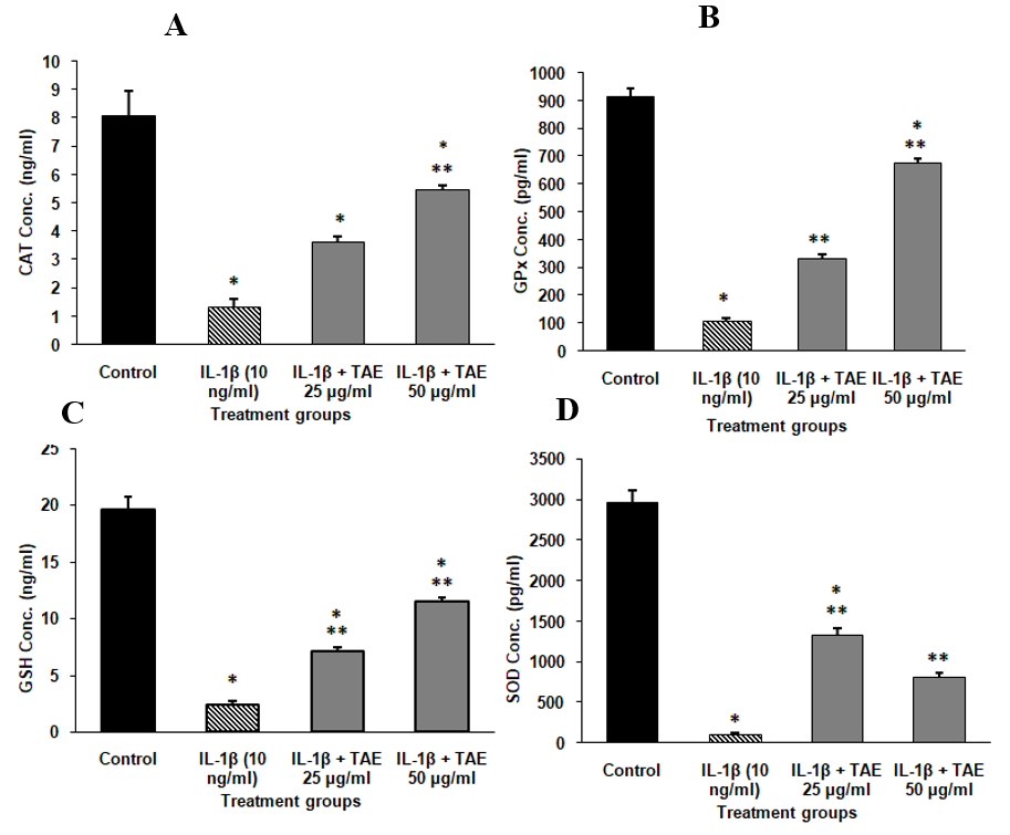 Cells cultured in a 6-well plate and incubated with CO2 for 1d, were treated with four groups: control, IL-1β, TAE, and TAE+IL-1β. The medium was removed, cells washed, trypsinized, and harvested, supernatant was collected and intracellular components were released through freeze-thaw cycles. Enzyme levels in the supernatant were determined according to Human CAT GENLISA™ ELISA, Human GPX1 ELISA, GSH GENLISA™ ELISA, Elabscience® Human SOD1 ELISA kit instructions.