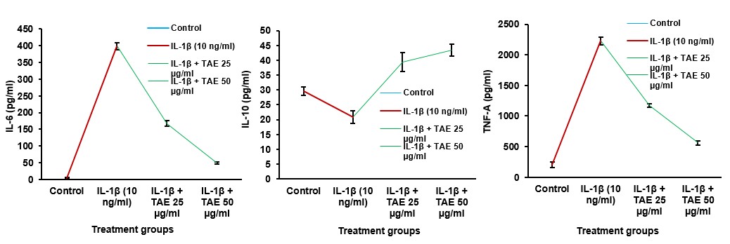Cells seeded in a 6-well plate and incubated for 24h. The spent medium was removed, and the cells were divided into control, IL-1β treated, TAE-treated, and a combination of IL-1β and TAE-treated. The protocol included adding standards and samples to wells containing immobilized antibodies, followed by incubation. The wells were then washed and treated with biotinylated antibodies, HRP-conjugated streptavidin, and TMB substrate. Absorbance was measured at 450 nm to quantify cytokine levels using the RayBio® Human IL-10 ELISA Kit, Human IL-6 ELISA Kit, and Human TNF-alpha ELISA Kit.