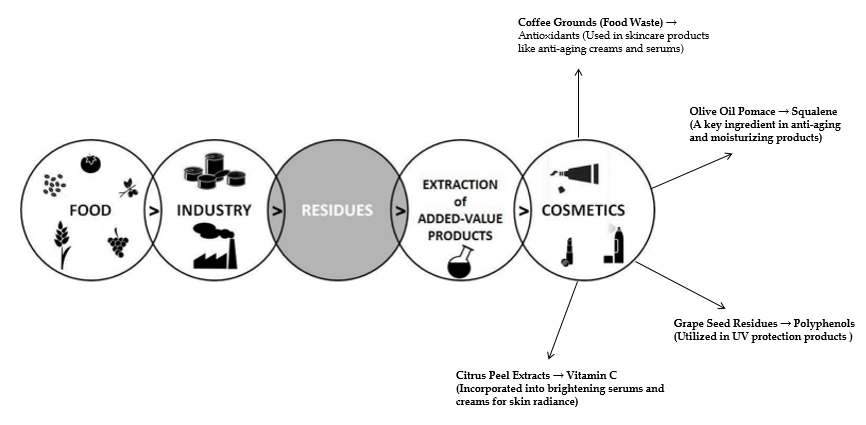 Fig. 2: Conversion of food-industry residues into added-value products to be used in cosmetic industry [16]