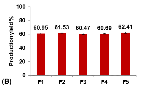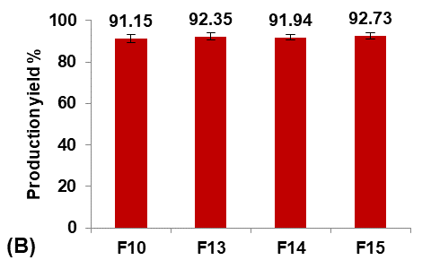 The production yield of micro-sponges was obtained by comparing the accurate weight of the final formed micro-sponges with the initial weight of the combined raw components. The percentage yield was calculated by the following equation [17]: