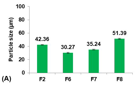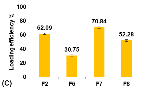 Production yield and loading efficiency increased significantly (p<0.05) with decreasing particle size, as shown in formulas F2, F7, and F8. At the lowest concentration of Eudragit-L100 (Formula F6), production yield and loading efficiency decreased significantly (P<0.05) despite the decrease in particle size due to the reduction in the Eudragit-L100 fraction available for Terconazole encapsulation [8]. Therefore, formula F6 was rejected from the study.