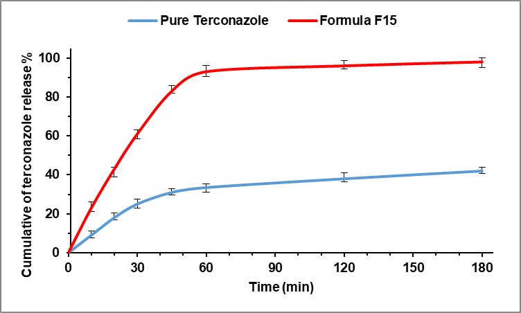 In comparison, 70% of Terconazole was released after 3 h from the optimized formula prepared as Cyclodextrin Stabilized Freeze-Dried Silica/Chitosan Nanoparticles as reported previously [10].