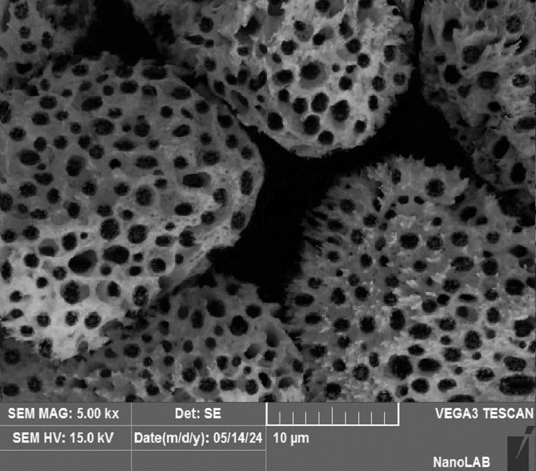 SEM technique was employed to survey the morphology and surface topography of the optimized micro-sponges formula. The sample was coated with gold-palladium, and then scanned using SEM (Inspect S50-FEI Company, Netherlands) under an argon atmosphere at room temperature [22].