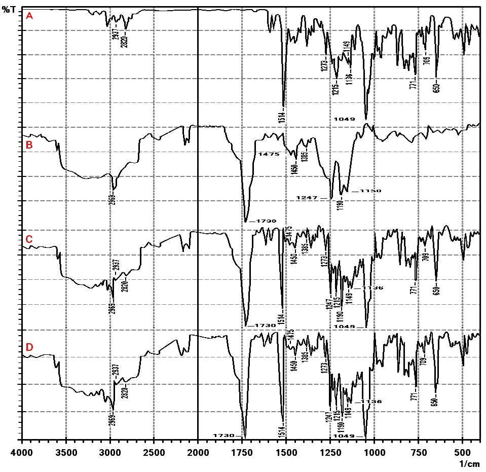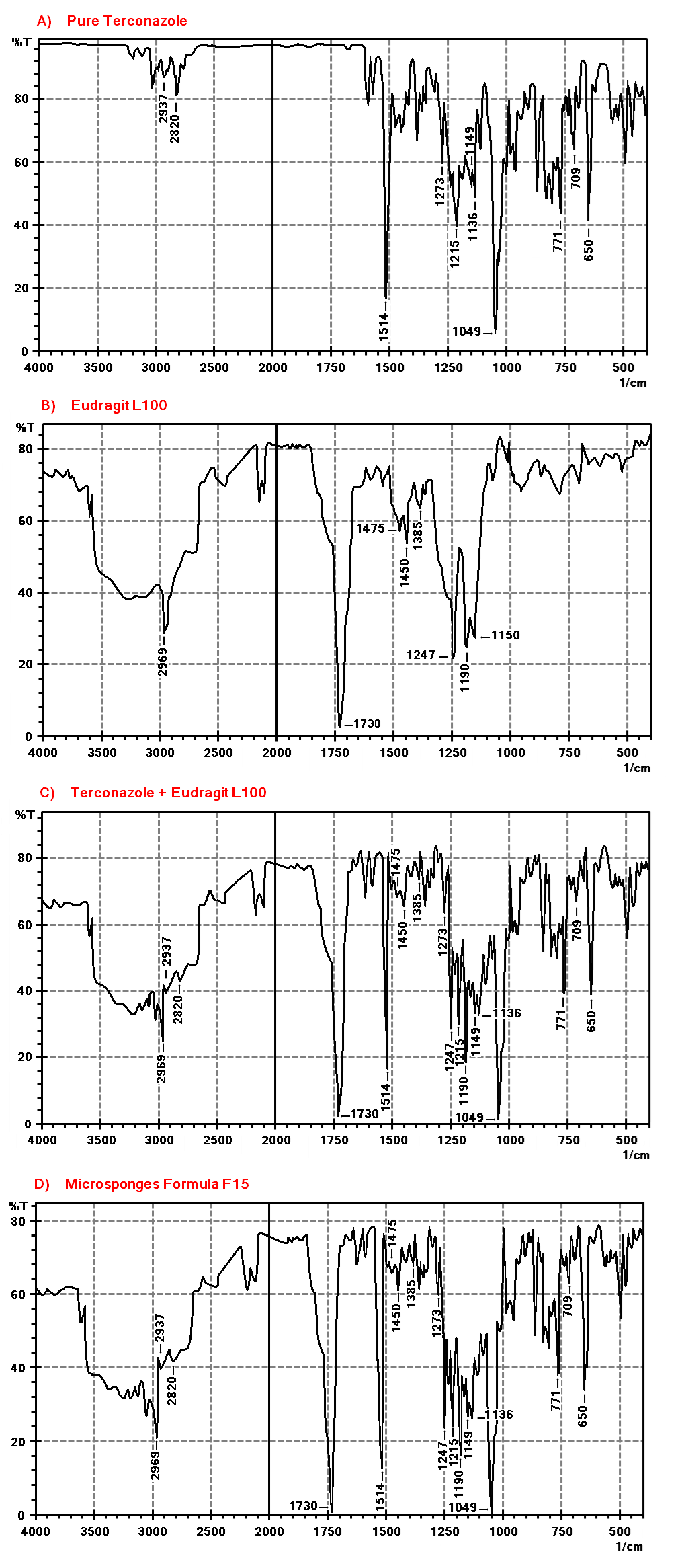 FTIR spectra are presented in fig. 8: A-D. Terconazole spectrum shows characteristic absorption bands at 1514 cm-1 (C=C stretching of aromatic ring), 1273 cm-1 (aromatic ether stretching), 1215 cm-1 (C-O stretching), 1149 cm-1 (C-O-C stretching) and 650 cm-1(C-Cl bond) [38].