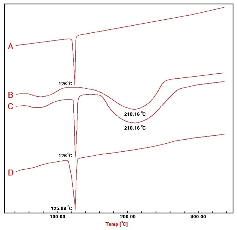 Fig. 9: DSC thermograms of A) Terconazole, B) Eudragit-L100, C) physical mixture, and D) formula F15