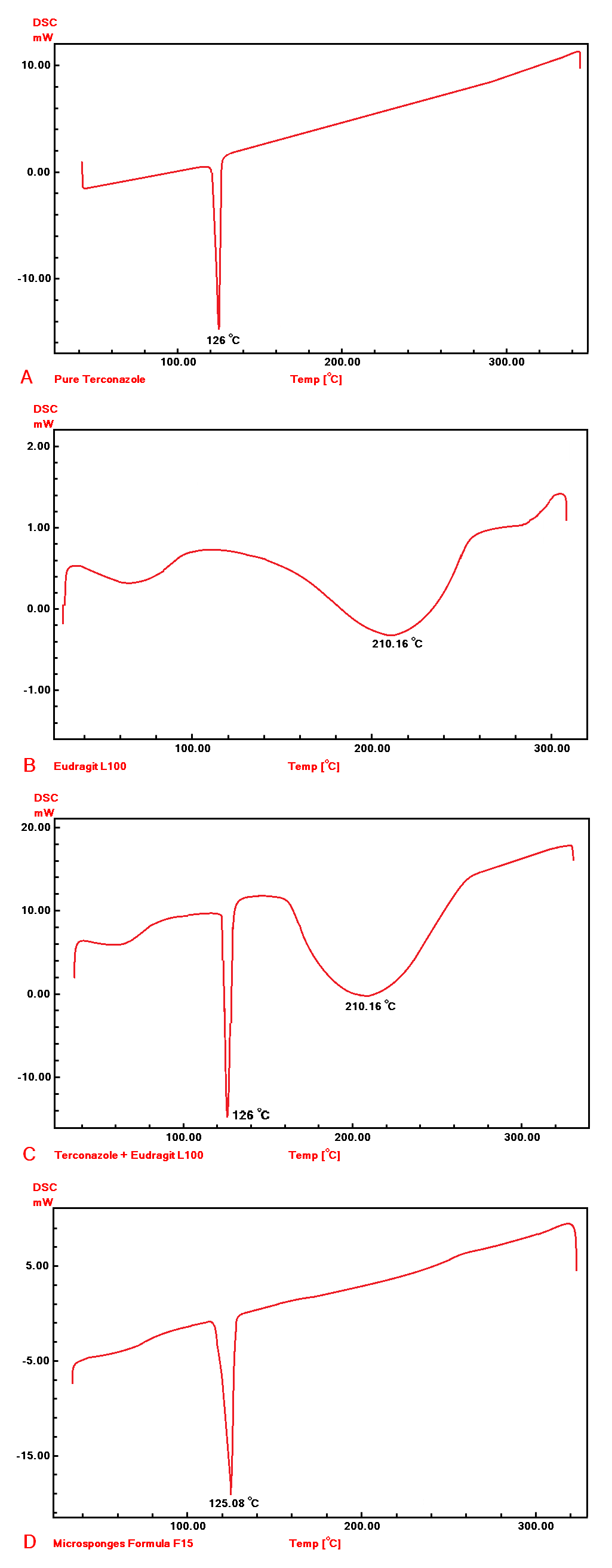 The DSC thermograms are presented in fig. 9: A-D. The terconazole curve shows a sharp characteristic endothermic peak at 126 °C, corresponding to its melting point, which indicates that Terconazole is used in a pure crystalline state [9].