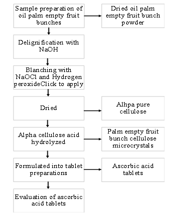 The materials used in this study were ascorbic acid, ethylenediamine, benzene, oil palm empty fruit bunches (OPEFB), ethanol, hydrochloric acid, hydrogen peroxide, iodine, spray-dried lactose (LSD), magnesium stearate, potassium chromate, potassium dihydrogen phosphate, potassium iodide, sodium sulfide p. a., talc, and zinc chloride.