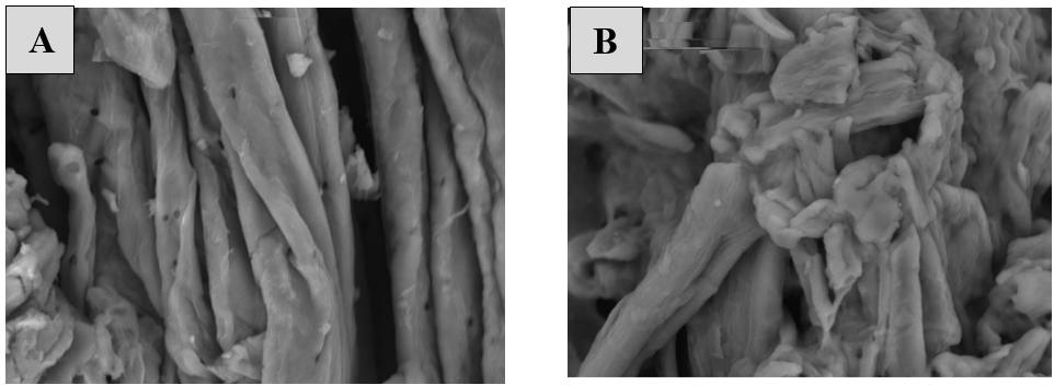 Fig. 2: SEM images of MCC obtained from (A) OPEFB; (B) Avicel pH 102 at magnification x3.000
