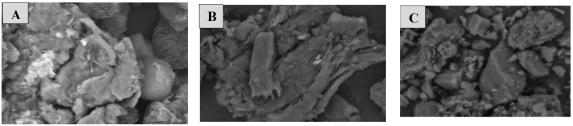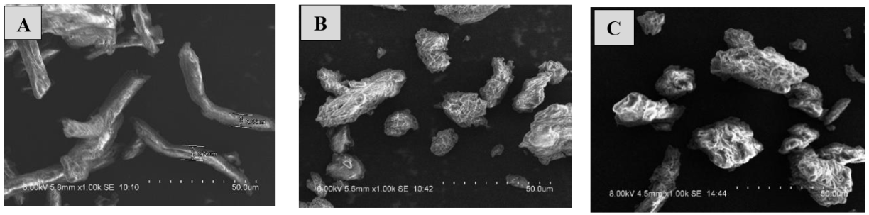 Fig. 3: SEM images of MCC obtained from OPEFB with varying sulfuric acid concentrations: (A) MCC 5%, (B) MCC 15%, (C) MCC 25%