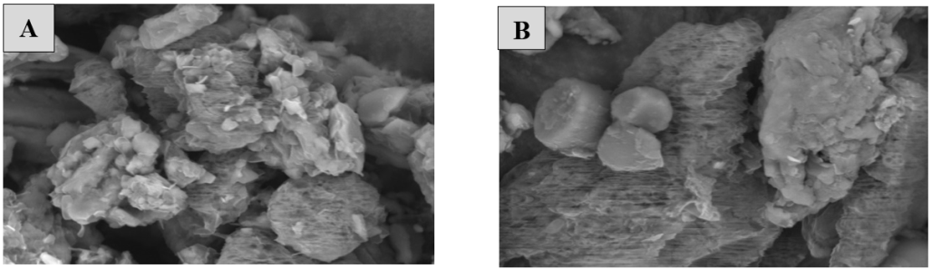 Fig. 5: SEM images of tablets with OPEFB MCC filler: (A) F1, (B) F3 at magnification x3.000