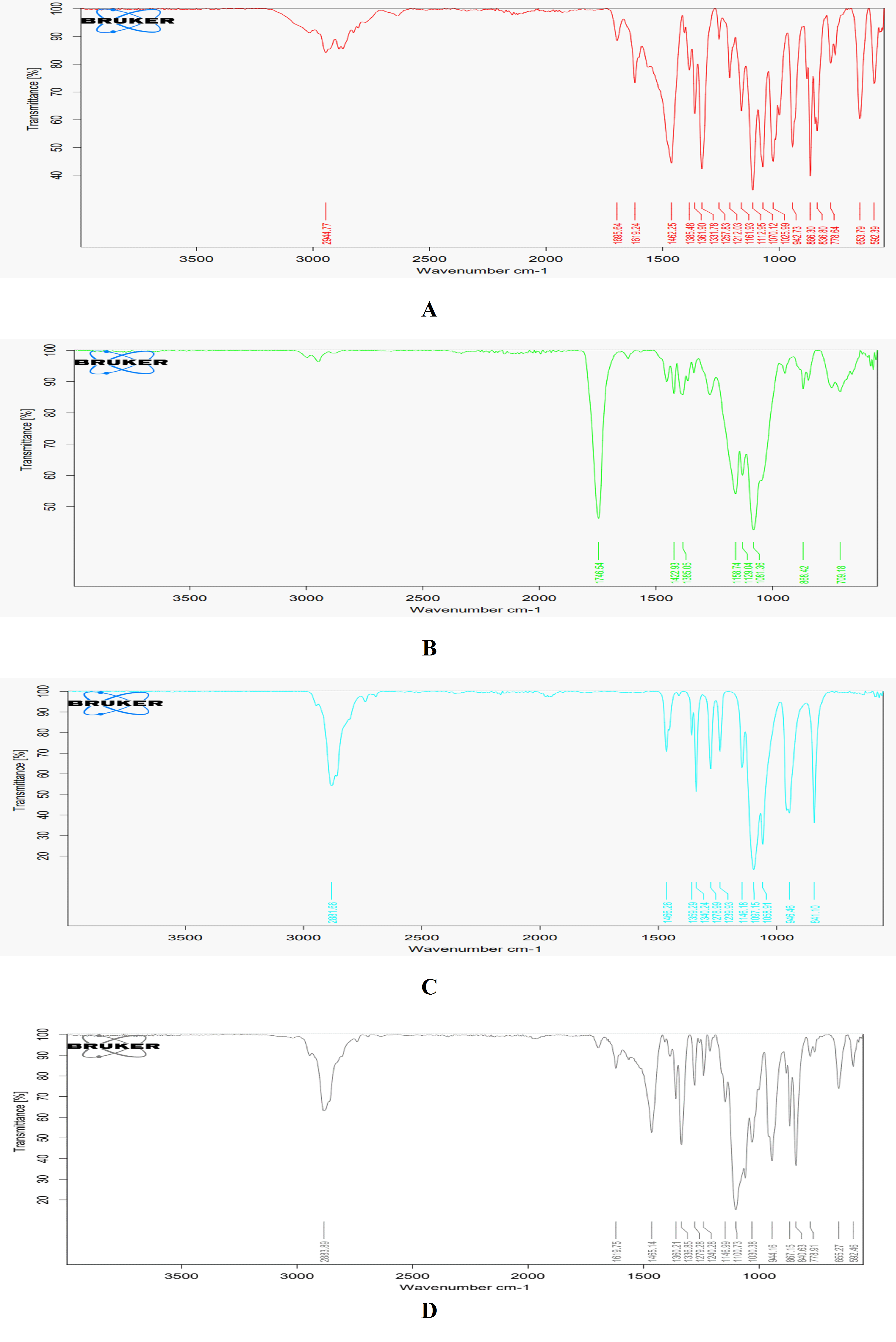Fig. 1: FTIR spectra of fluvoxamine maleate B: FTIR spectra of PLGA 50:50, C: FTIR spectra of PEG 6000, D: FTIR spectra of the physical mixture