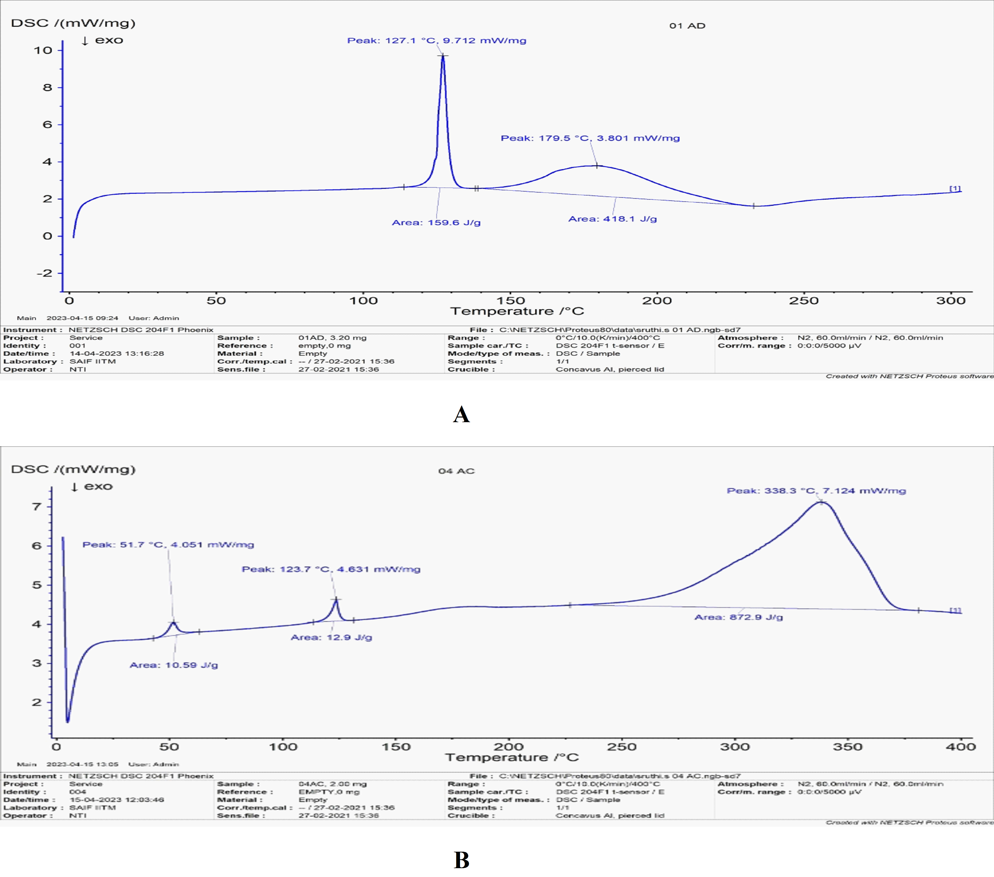 Utilizing Differential Scanning Calorimetry (DSC) (NETZSCH DSC 204F1 Phoenix), the study examined the drug's, excipient's, and mixture's thermal characteristics. Plotting the findings downward, the results assessed the drug's compatibility with the excipients and it’s heat stability. To ensure formulation stability, DSC analysis is essential during the preformulation stage. It offers information about the drug's and the excipients' thermal stability [11].