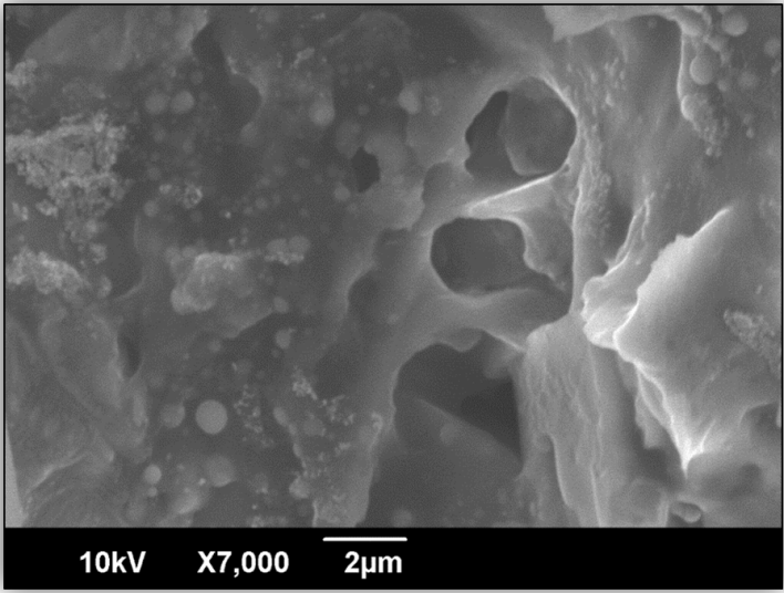The SEM analysis of freeze-dried formulations revealed a porous, micro void-like surface morphology, enhancing drug dispersion and dissolution rates (fig. 4). The mean particle size was 810 nm, with a percentage porosity of 1.709%, indicating a relatively dense implant structure that aids in sustained drug release by minimizing rapid diffusion and initial burst effects while improving mechanical stability. The ISFI delivery system exhibited low porosity and a spongy texture, primarily influenced by hydrogen bonding between NMP and PEG, which significantly affected the drug release profile by restricting NMP diffusion into the release medium. This controlled porosity contributes to a slower drug release rate, beneficial for sustained drug delivery. Similar studies have reported that ISFIs containing DMSO and NMP formed porous, foam-like structures, whereas denser, less porous depots were observed with different solvent compositions. The findings from this study align with research of Zhang et al. [22], demonstrating that solvent selection and porosity play crucial roles in controlling the structural characteristics and release kinetics of ISFIs.