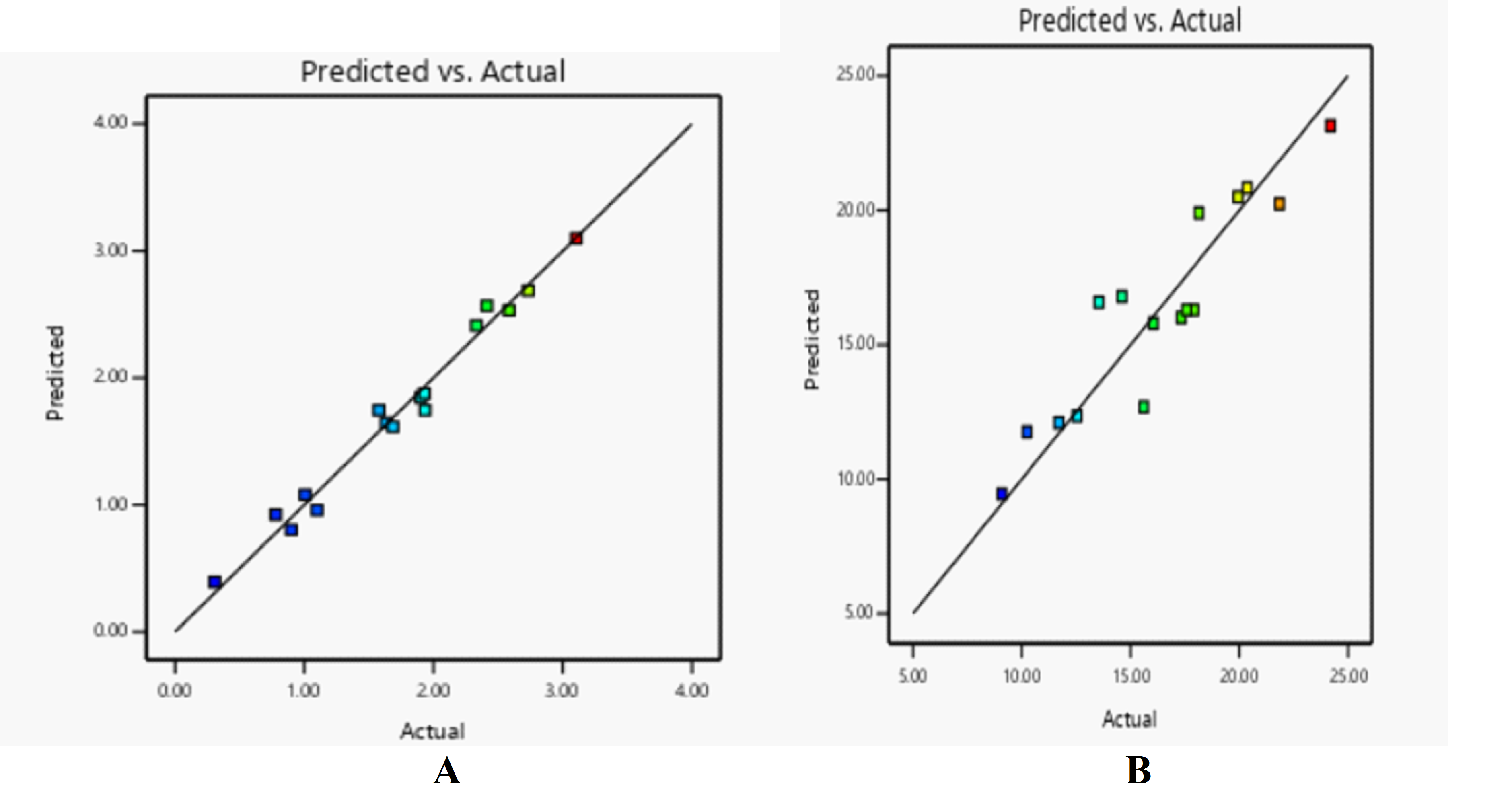 ANOVA was used to validate the linear model, which demonstrated the considerable influence of factors on drug release profiles. Responses were considerably impacted by the concentrations of PEG and PLGA. The model's accuracy and predictive power were confirmed by high R² values and a small gap between adjusted and anticipated R² values (table 7). The expected vs. actual graphs for each response are displayed in fig. 5A and 5B. Strong signal-to-noise ratio and adequate precision values for Y1 and Y2 (45.145 and 15.308) demonstrated the model's dependability in navigating the design space.