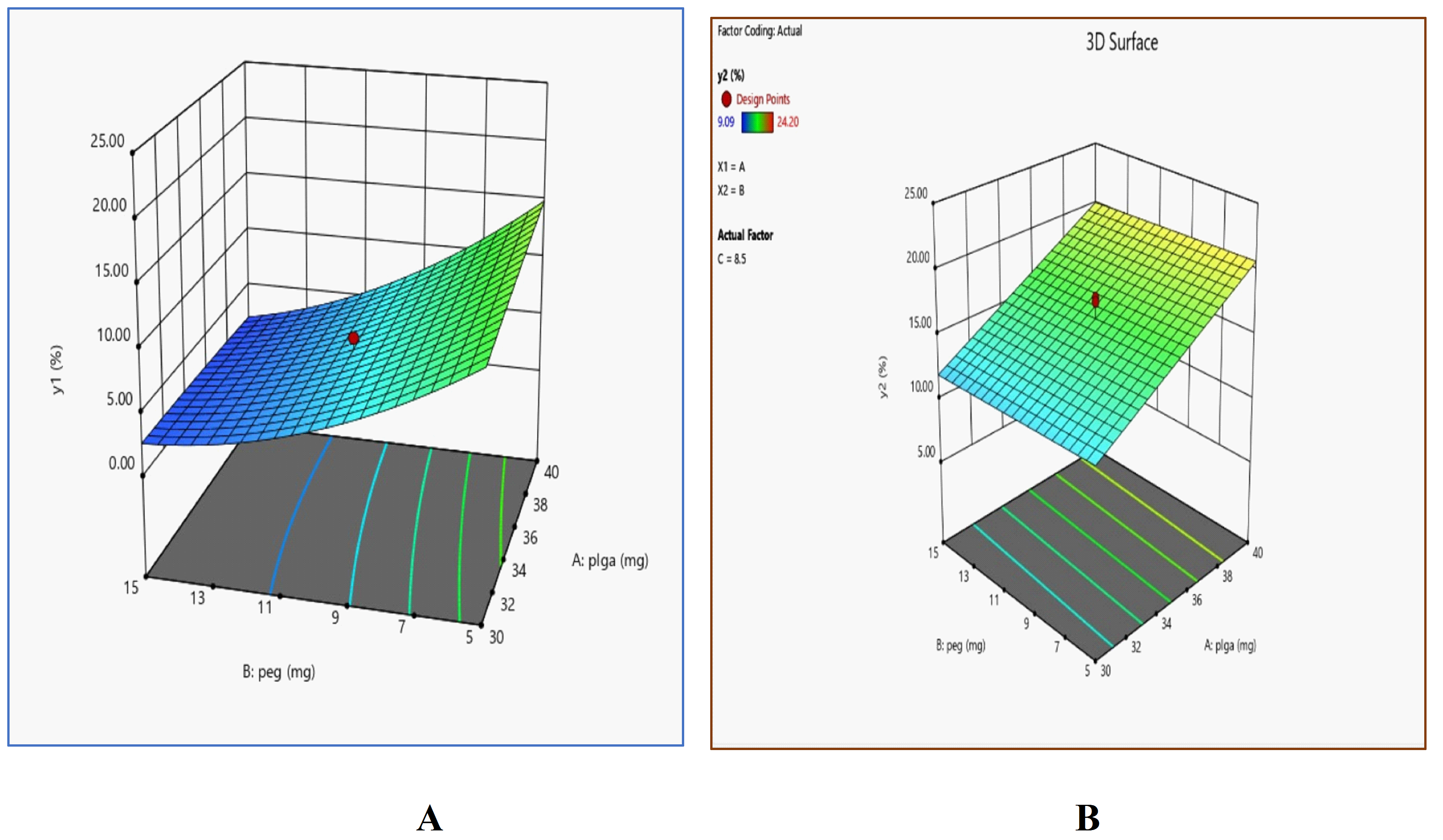 Fig. 6: 3D surface response plots showing the effect of PLGA (mg) and PEG (mg) concentrations on the dependent variables: A Y1 (%) and B Y2 (%)