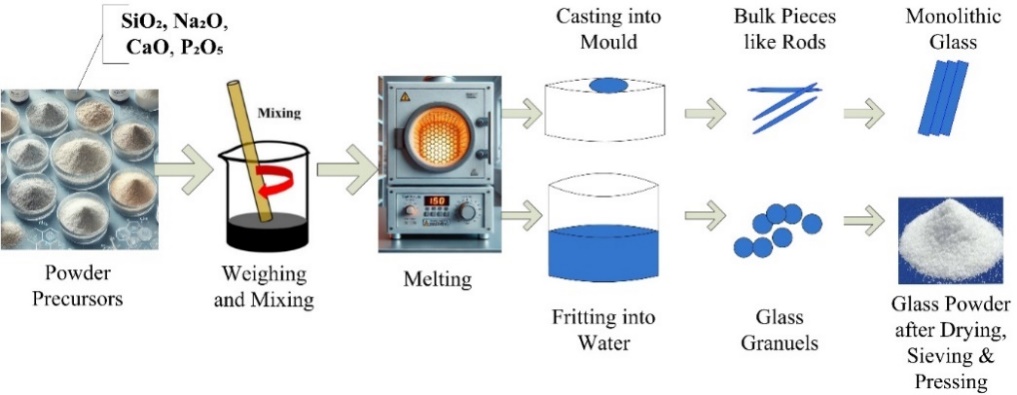 The production of oxide glasses such as 45S5 initially relied on melting, as described in Hench's original methodology. This process requires appropriate amounts of various chemicals, typically in the powder form, such as nitrates, oxides, sulfates, and carbonates. The procedure involved selecting a suitable glass composition, weighing and mixing the components, and melting them at appropriate temperatures. Compared with silicate glasses, glasses made from borates and phosphates typically have lower melting temperatures [43]. When producing large-scale items, such as monoliths and rods, the uniform molten material transferred into appropriate molds and left to solidify. The molten glass cooled in cold water to produce a glass powder or frit. The resulting small glass fragments were dried, crushed, and sieved [44]. Fig. 1 illustrates the main steps of bioglass preparation using the melt-quenching method.