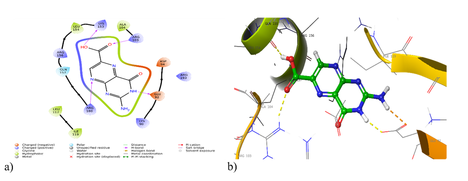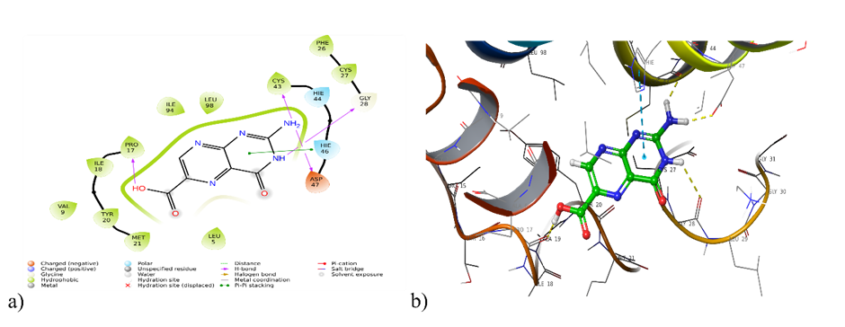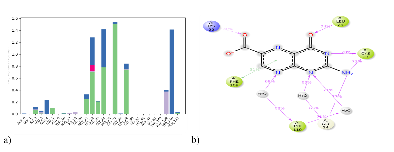 Fig. 6: Active site amino acid residue contacts of pterin 6 carboxylic acid with 4UY1 a) Protein-ligand contact analysis of MD trajectory, (b) 2D interaction diagram