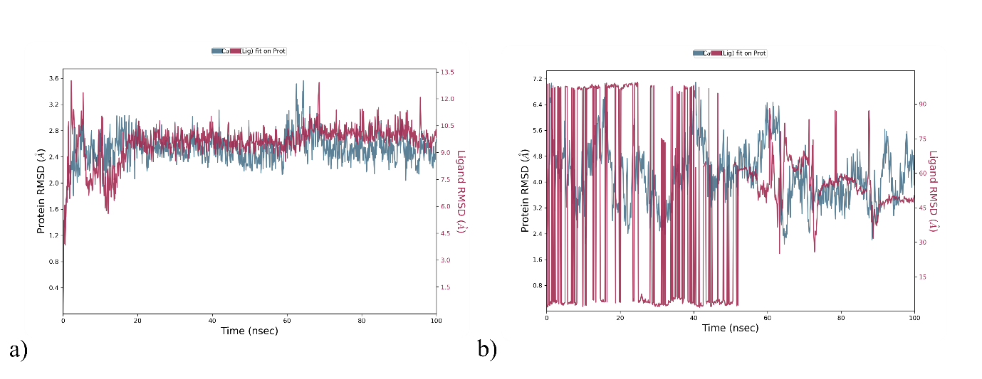 Fig. 5: RMSD analysis of a) Pterin 6 Carboxylic acid with 4UY1 b) Pterin 6 Carboxylic acid with 1A3Q