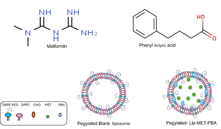Fig. 1: Structure of metformin and phenyl butyric acid, images of pegylated blank liposomal and Lip-MET-PBA