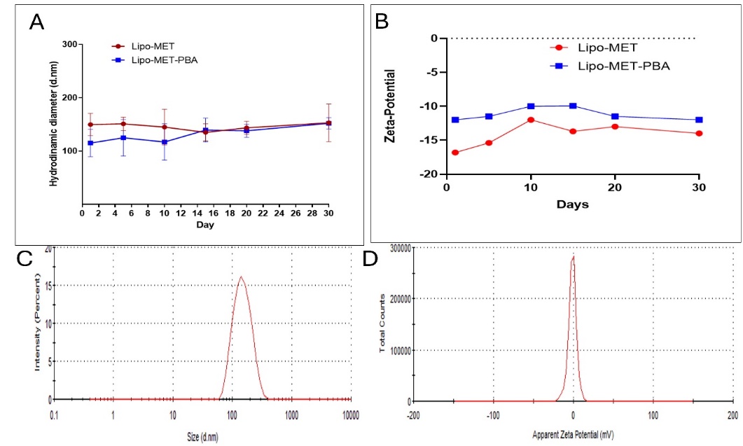 Fig. 2: Stability size distribution and zeta potential over one month of Lip-MET and Lip-MET-PBA (each experiment was done three times, mean±SD n=3)