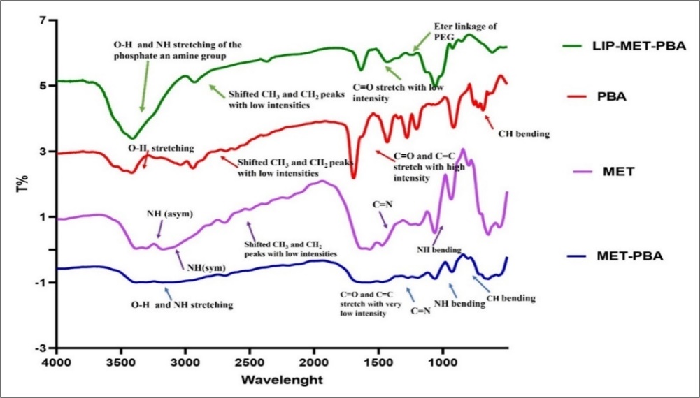 Lyophilized liposomes encapsulating with MET and PBA were analyzed utilizing FTIR spectroscopy (fig. 3). The liposomes spectrum showed abroad band between 3700 and 3100 cm-1 for O-H stretching of phosphate and cholesterol phenol groups. Additionally, notable bands were found at 2857 and 2927 cm-1 for CH3 and CH2, respectively, that corresponded to intermolecular interactions between phospholipids hydrocarbon chain via van der Waals interactions. Furthermore, lip-MET-PBA spectrum showed a 1169 cm-1 band corresponding to the ether linkage of polyethylene groups (PEG). A spectrum of a low-intensity stretching bands for C=O and C=C that may be attributed to the aromatic and carbonyl groups of the encapsulated PBA. Lip-MET-PBA spectrum may act as a good indication for liposomes stability before and after lyophilization. Spectrums of MET and PBA displayed N-H band and for O-H stretching in the 3700 and 3100 cm-1, respectively. Furthermore, stretching bands for C=O and C=C may be attributed to the aromatic and carbonyl group in PBA in its powder spectrum.