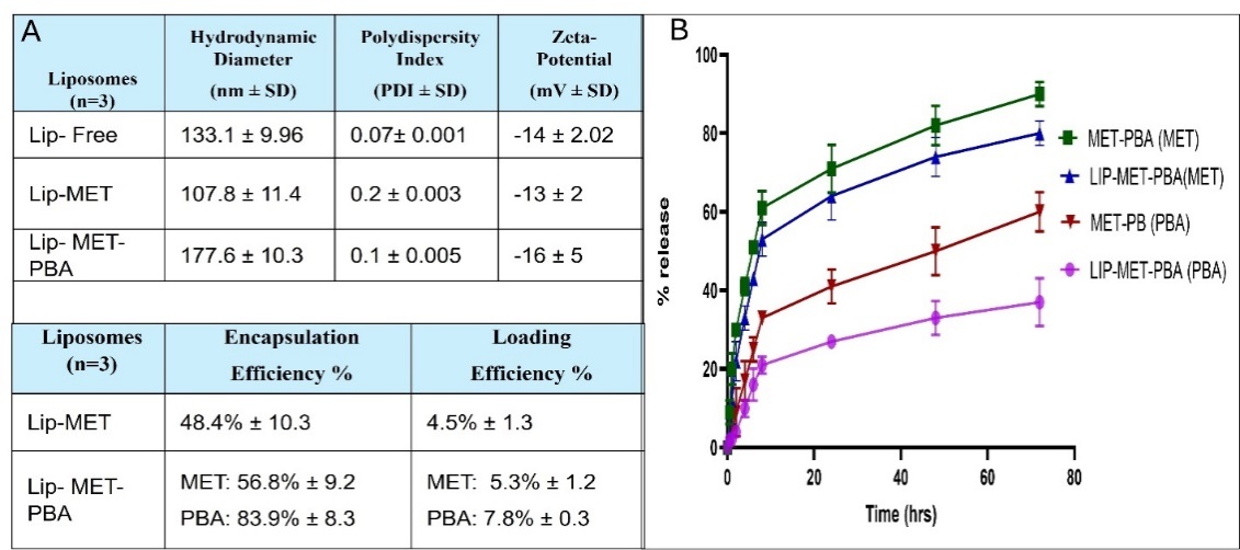Fig. 4: (A) Summary table for the average hydrodynamic diameter, zeta potential, PDI, Encapsulation efficiency (EE%) and Loading Efficiency (LE%) (B) Release profile of both MET and PBA from Lip-MET-PBA and MET-PBA at 37 °C (each experiment was done three times, mean±SD n=3)